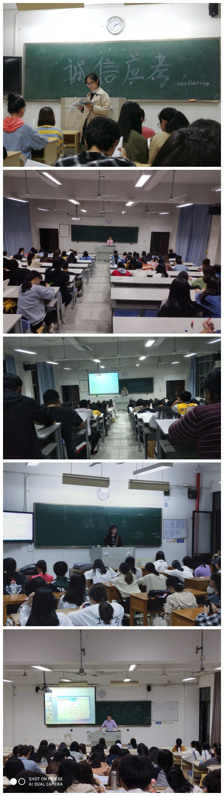 各班主持人带领大家认真学习了《考试管理工作办法》、《违纪处分规定》等相关文件中关于诚信考试的内容,并通过讲述真实的因为考试作弊而被处分的案例,告诫同学们诚信对于一个人的学习、事业、交际的重要性,让同学们清楚的认识到了考试作弊的危害。告诫大家不要做缺失诚信的事情,要做一个讲诚信的人。虽然这些不劳而获的事情很有诱惑力,但一定要坚定自己的信念,坚决抵制诱惑,要自尊自信,做个诚实守信的人。