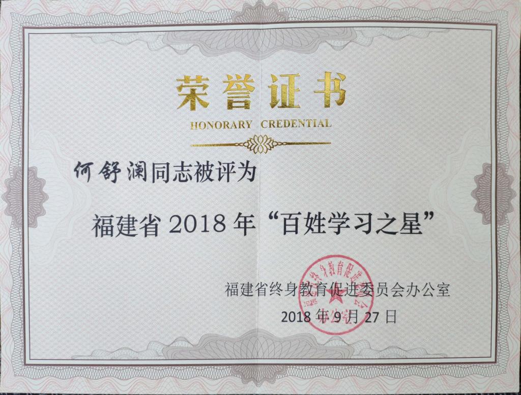 2018年9月28日下午,2018年福建省“9·28终身教育活动日”暨全民终身学习活动周开幕式在福建广播电视大学综合楼六楼隆重举行,我系何舒澜同志荣获2018年福建省“百姓学习之星”称号并作为代表出席本次开幕式。
