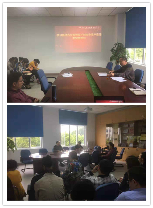 10月11日下午,药学系党总支组织全系教职工学习《福建省党政领导干部安全生产责任制实施细则》。会议由总支书记郑力宏主持。 会上,郑书记对下一步安全工作提出四项建议:一是进一步提高思想认识,认真贯彻落实习近平总书记关于安全生产一系列重要指示和党的十九大精神;二是进一步抓好责任落实,就是要把责任落实到位,主动履职担当;三是进一步做好风险防控和隐患排查,抓好安全生产大检查,坚决贯彻“安全第一、预防为主、综合治理”方针;四是进一步做好巡查隐患工作,对巡查发现的问题要立行立改、明确责任、强化措施。