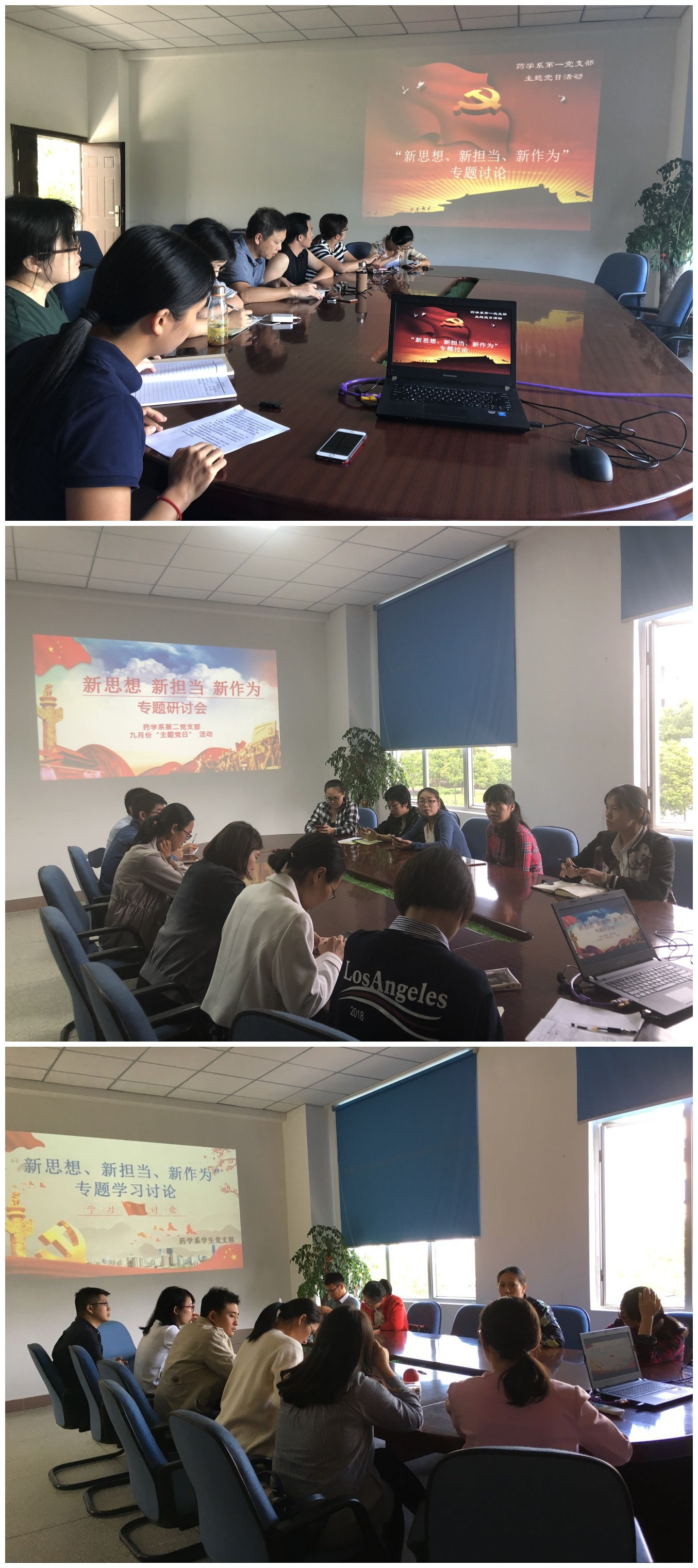 9月下旬,药学系党总支三个支部分别在系会议室召开“新思想、新担当、新作为”的主题党日交流活动。主题党日活动分别由三个支部书记主持,全体党员参加了本次主题党日交流活动。参会的党员同志结合近期学习新思想的情况和工作实际,畅谈自己对思想解放的大讨论和学习新思想的心得。