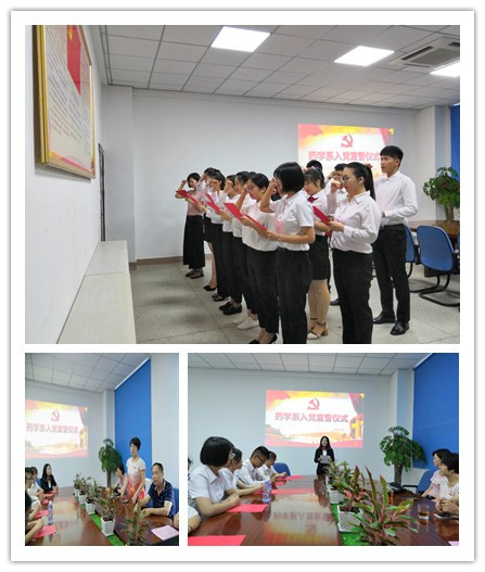 届毕业生的新党员宣誓仪式。党工部副部长柯琼莺、药学系党总支委员、支部书记及
