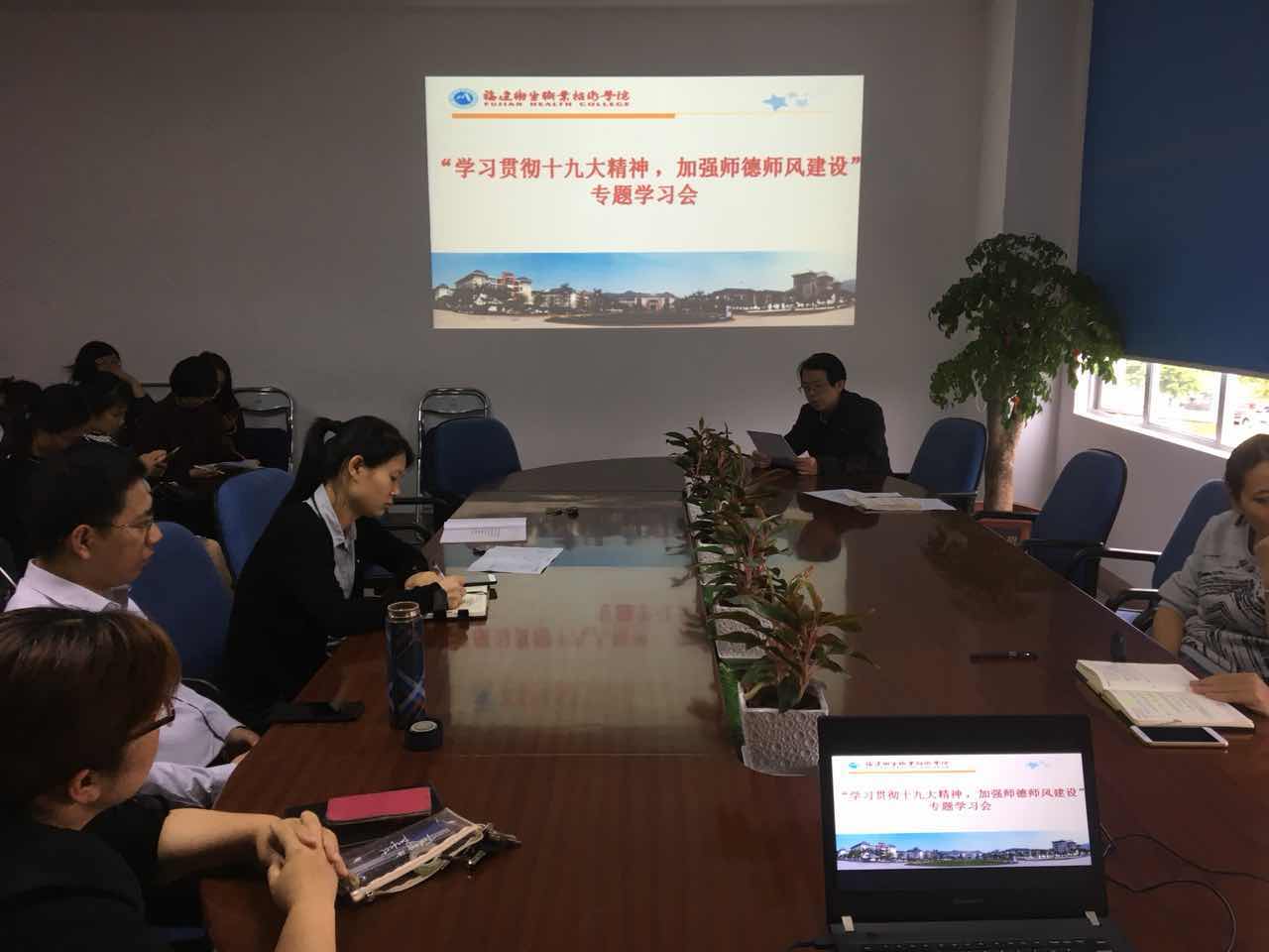 5月3日,药学系在系会议室召开“学习贯彻党的十九大精神 ,加强师德师风建设” 专题学习会。全系教职工参加本次学习会,会议由系党总支副书记陈洁同志主持。
