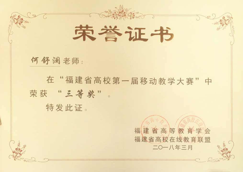 喜报--我系何舒澜老师获福建省高校第一届移动教学大赛三等奖