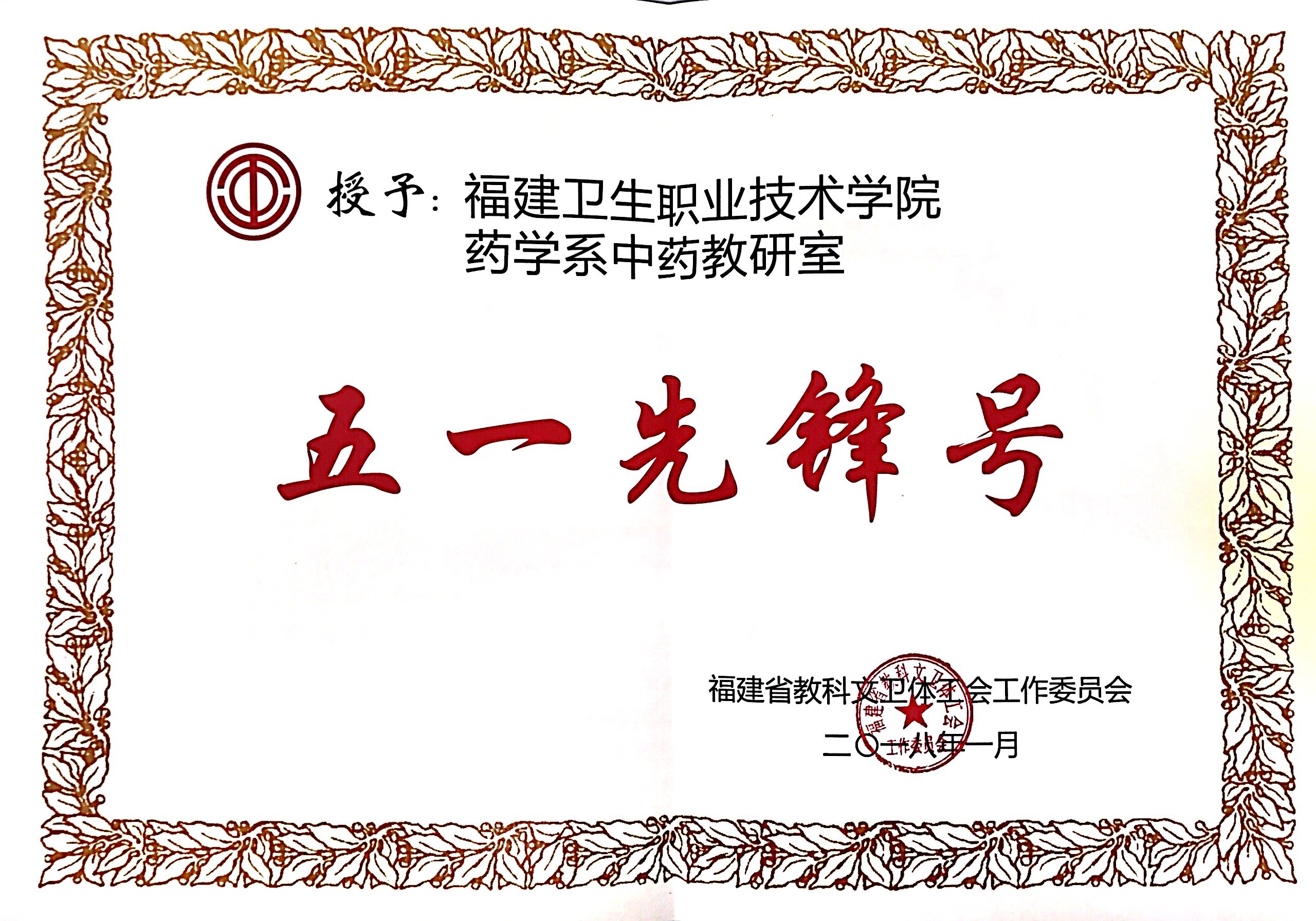 近日,为树立典型,表彰先进,福建省教科文卫体工会颁发《关于表彰福建省教科文卫体系统模范教(职)工之家(小家)和命名省教科文卫体系统五一先锋号的决定》(闽教科文卫体工〔2018〕2号)。我系中药教研室被授予福建省教科文卫体系统“五一先锋号”荣誉称号。