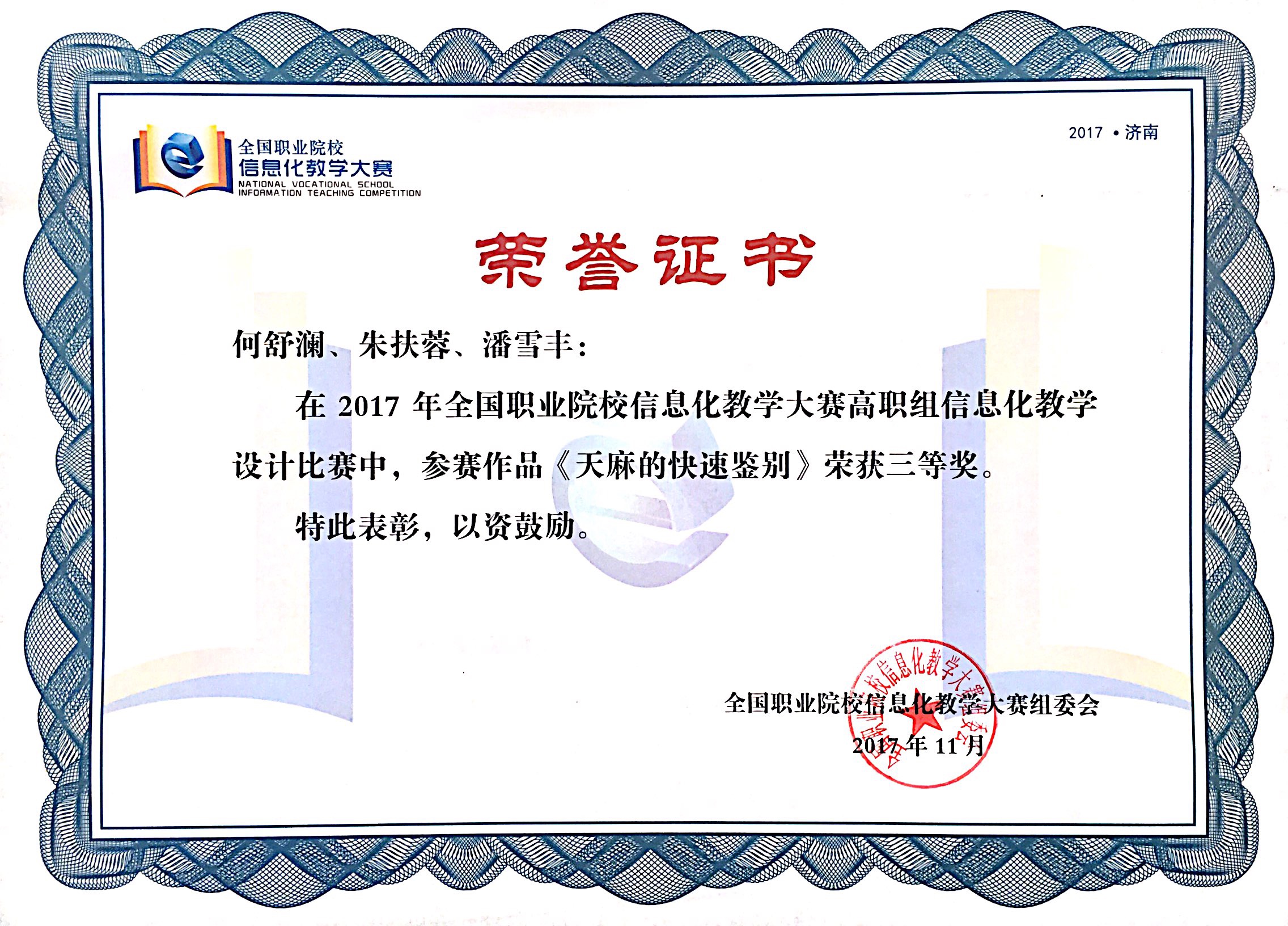 我系何舒澜、朱扶蓉、潘雪丰等三位教师的参赛作品《天麻的快速鉴别》作品经过院赛、省赛、省选拔赛、国赛网络评审等层层选拔,最终进入决赛,并凭借先进的教学理念、精巧的教学设计,精湛的授课能力获得高职组信息化教学设计大赛三等奖。