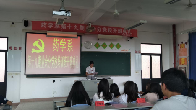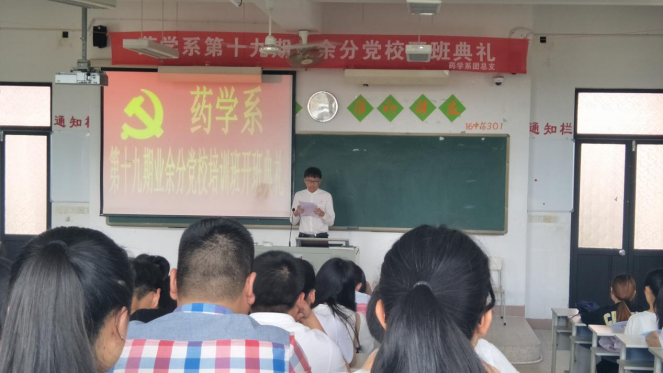 2017年5月11日下午,药学系第十九期业余分党校开班典礼在教学楼209隆重举行。莅临本次大会的老师有:药学系团总支副书记尹德爱老师,辅导员李宝珠老师,陈翰老师。