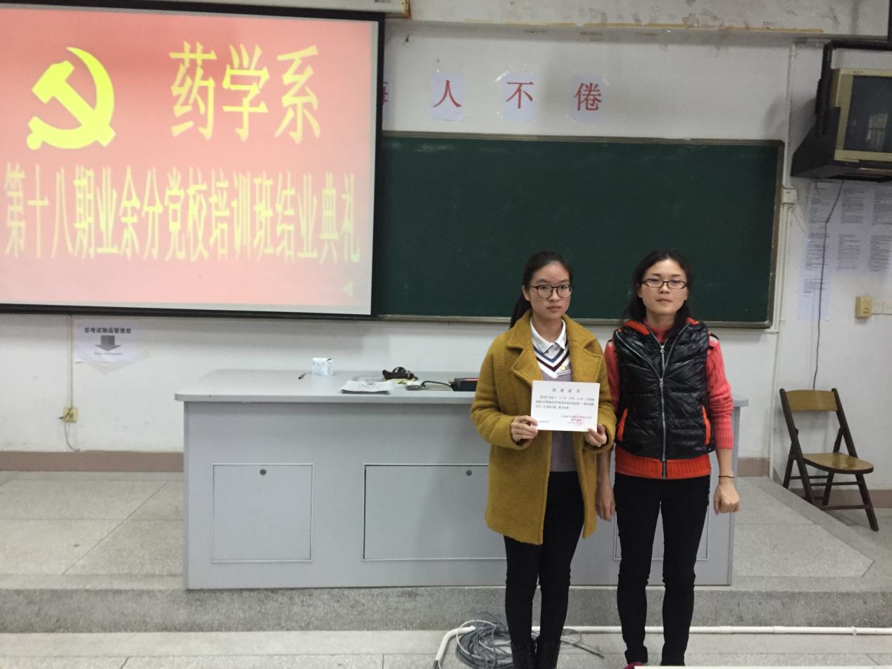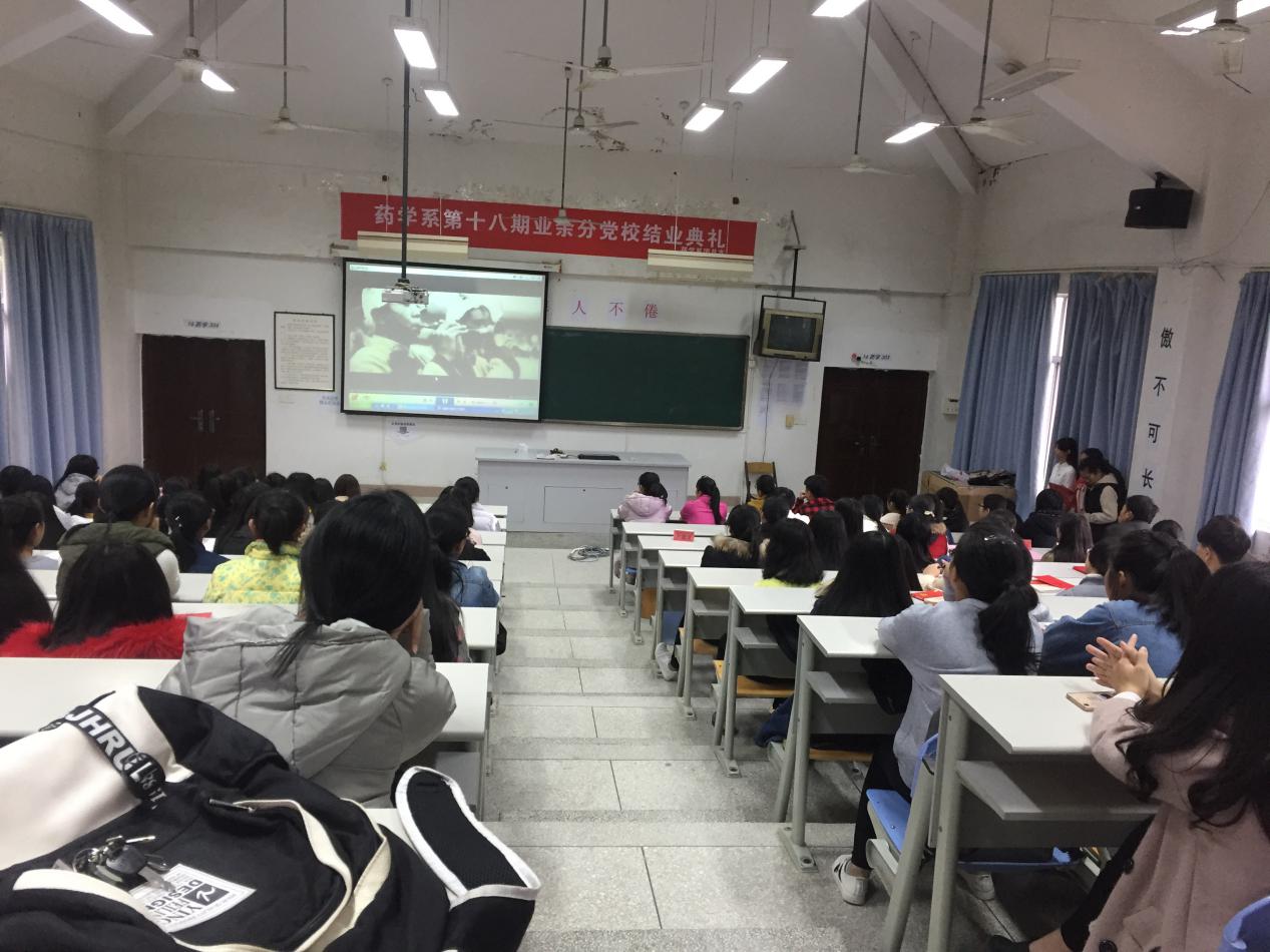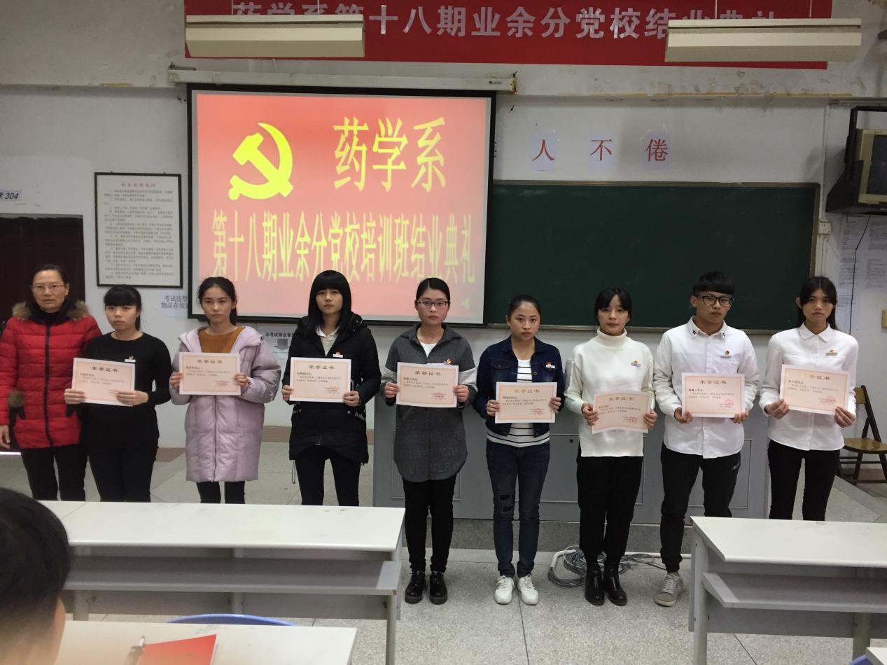 2016年12月27日,药学系第十八期业余分党校结业典礼在药二阶隆重举行。莅临本次大会的老师有:药学系党总支林燕副书记、药学系团总支书记李宝珠老师及辅导员胡丹老师、苏素娇老师、陈翰老师、尹德爱老师。老师们的莅临指导体现了我系对积极向党组织靠拢的学生的鼓励与重视。
