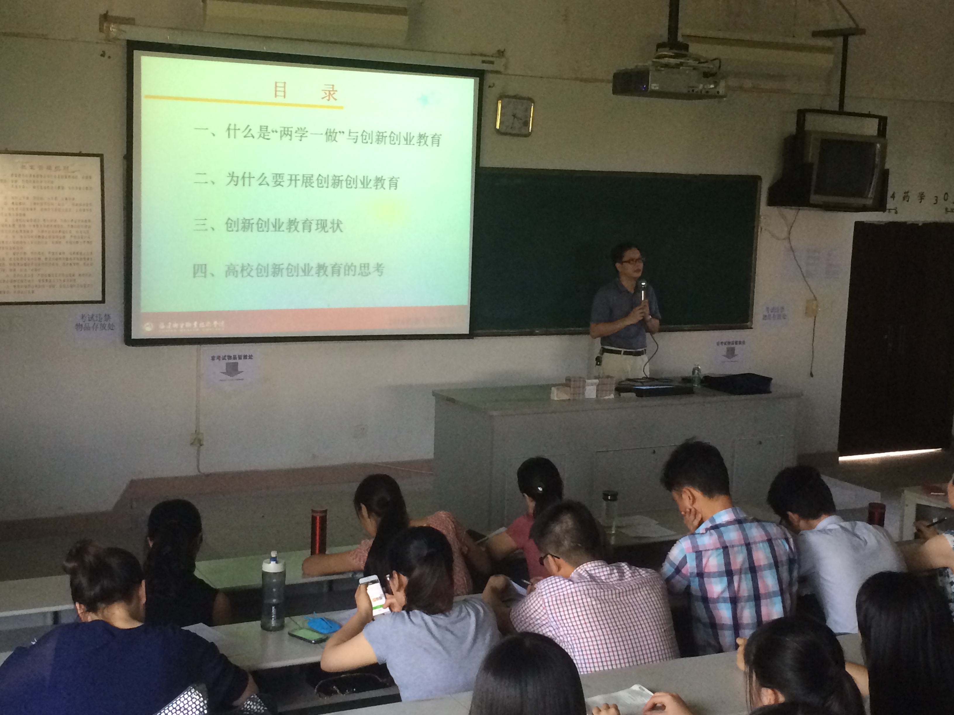 廖副院长围绕什么是“两学一做”与创业创新教育、为什么要开展创业创新教育、创新创业教育现状、高校创业创新教育现状等四个方面对高校创新创业工作作了详细的讲解。他指出搞创新创业教育首先要注重培养学生知识获取的能力、分析解决问题的能力。其次要转变教育理念,创新创业工作是面向全体学生的、是全体教师参与的、是融入到人才培养全过程的;要建立创新创业教育课程体系;要改革教学方法;要加快推进学分制教学改革;要鼓励大学生参加各类创新创业比赛和职业技能比赛。