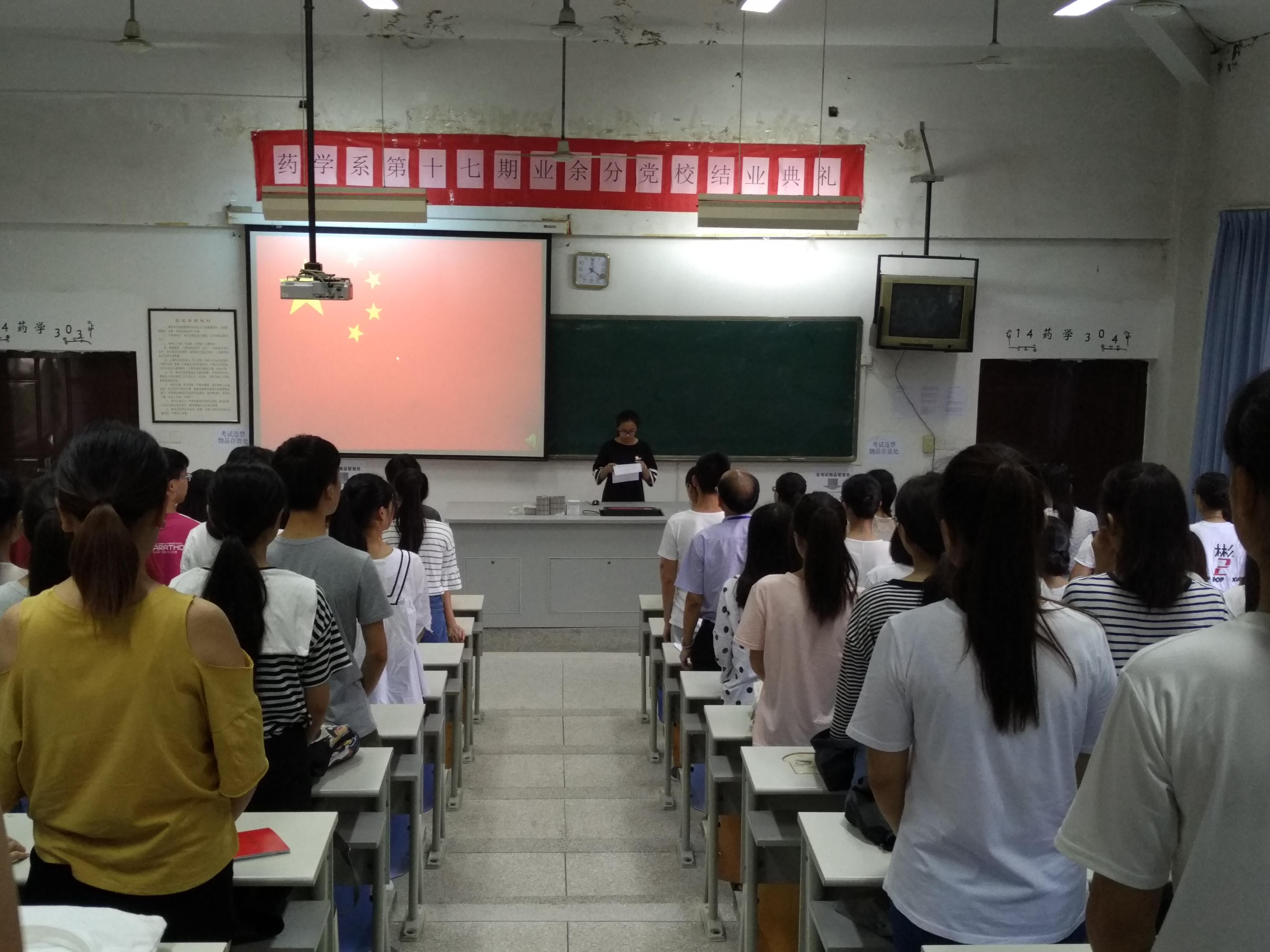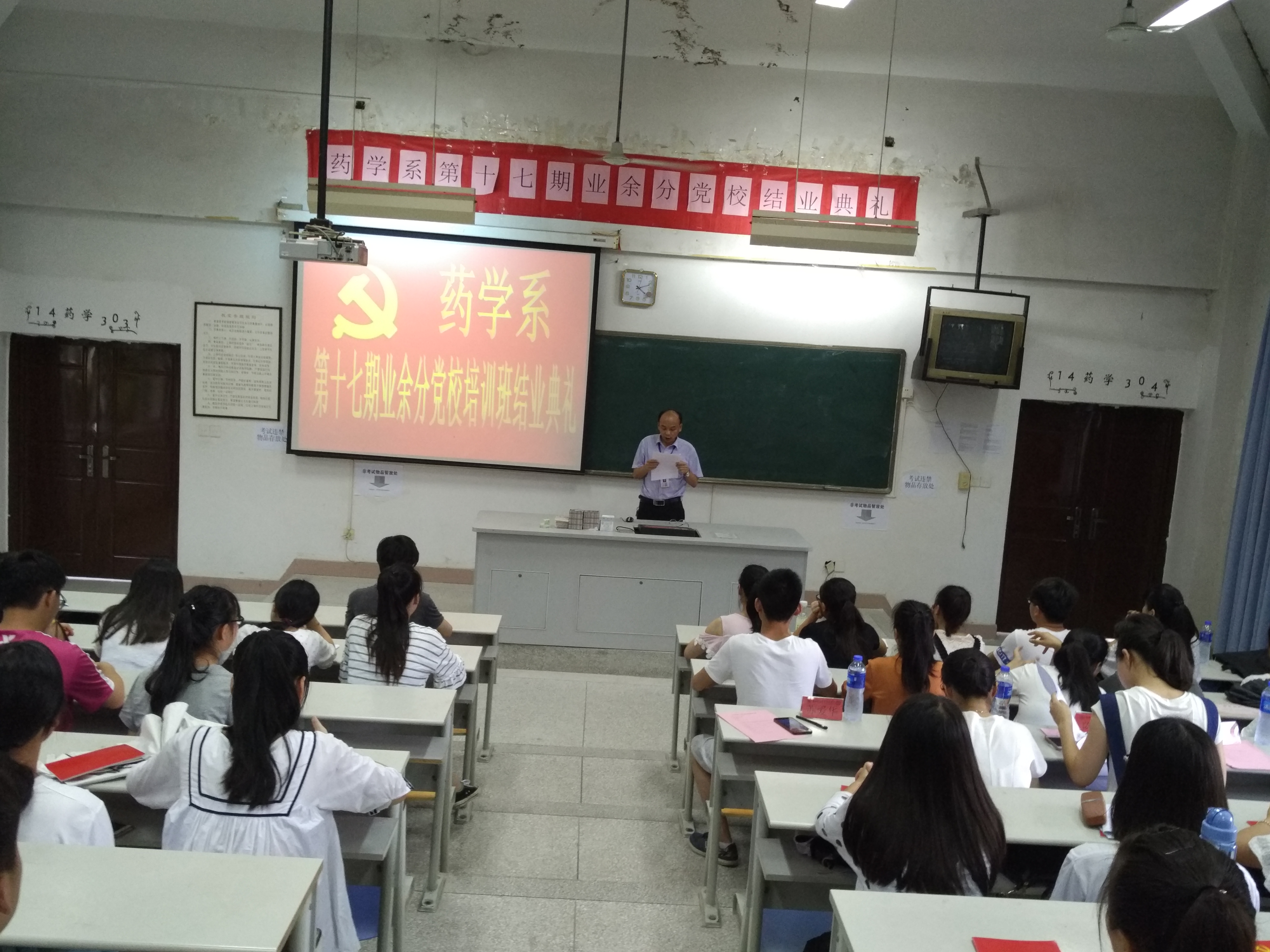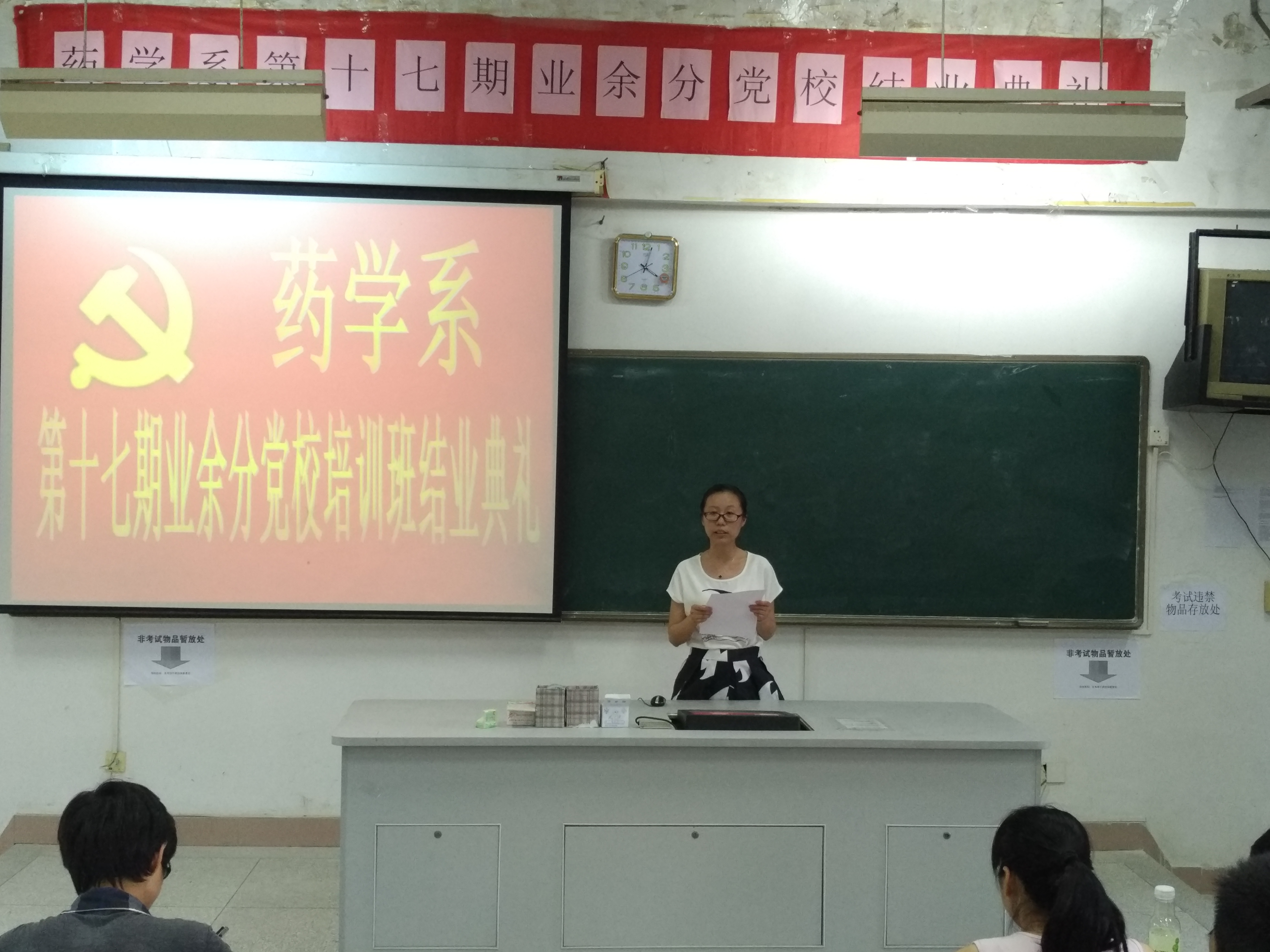 ,药学系第十七期业余分党校结业典礼于药二阶隆重举行。莅临本次大会的领导老师有:药学系党总支苏爱华书记,第一党支部书记叶雅沁老师以及学生党支部书记陈瑜老师。