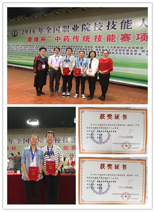 2016年5月21至22日,在连云港举行的“2016年全国职业院校技能大赛高职组中药传统技能大赛”中,我系叶玉梅、苏映萱同学不畏强手,沉着应对,最终都获总决赛二等奖。 赛前,指导老师罗兰、何舒澜以及其他专业课教师对选手进行了严格的强化训练。在赛场上,她们面对来自全国的强手,发挥稳定、表现出色,为学校争得了荣誉。 佳绩的取得,凝聚了各级领导的亲切关怀和悉心指导, 凝聚了参赛学生、相关指导老师的辛勤汗水,同时展示了我院学生优秀的职业技能和职业素养。向他们表示最热烈的祝贺和衷心的感谢!