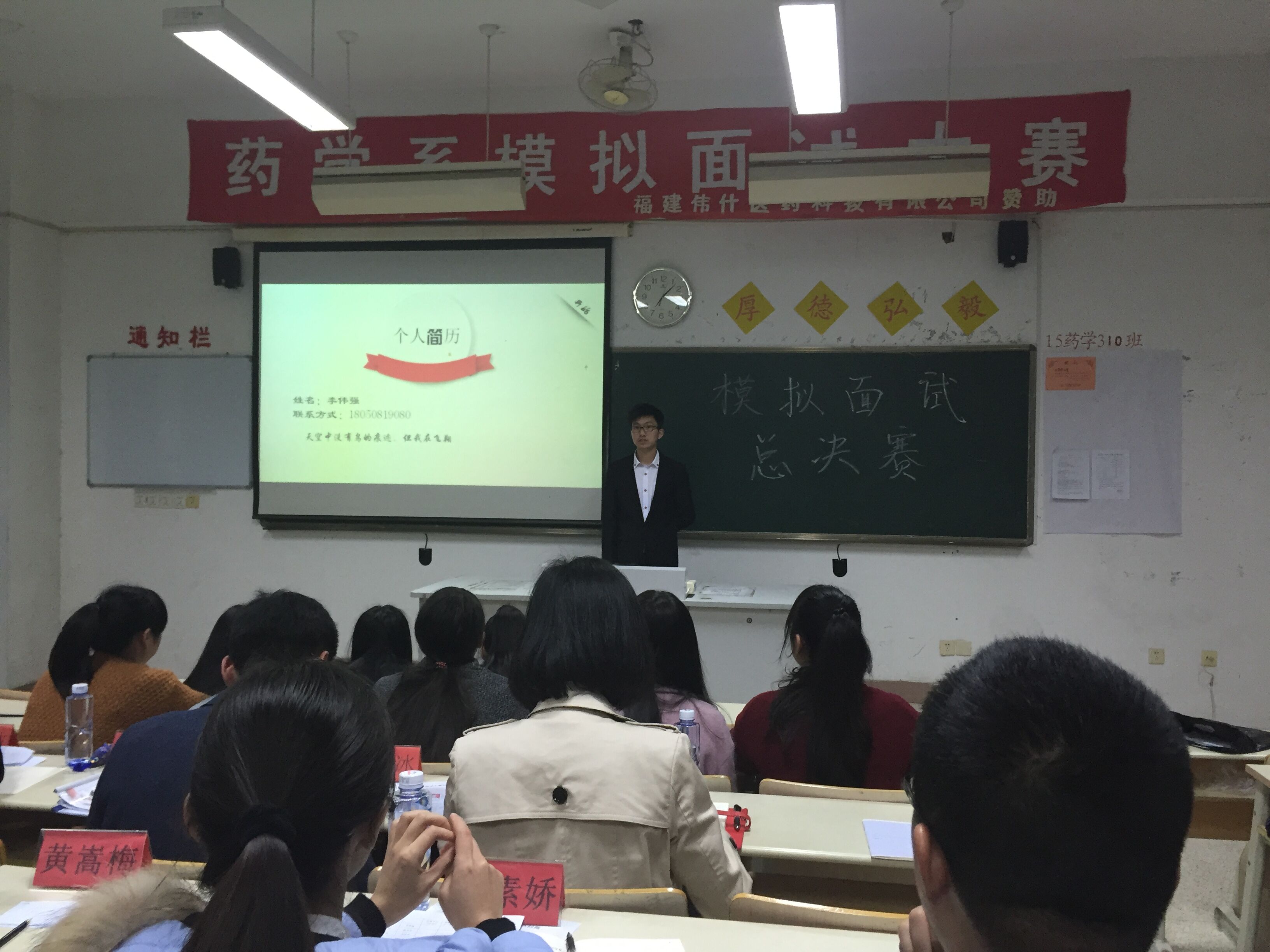 药学系于3月29日晚在教学楼215教室举办模拟面试大赛总决赛。为更好地模拟医药企业面试场景,本次大赛特邀葛兰素史克公司销售大区经理张少波先生,辉瑞公司销售主管刘楚先生以及福建伟什医药科技有限公司人事经理池化冰先生、HR专员郑彬焮学姐到场担任评委,药学系苏爱华书记及各辅导员们应邀出席。