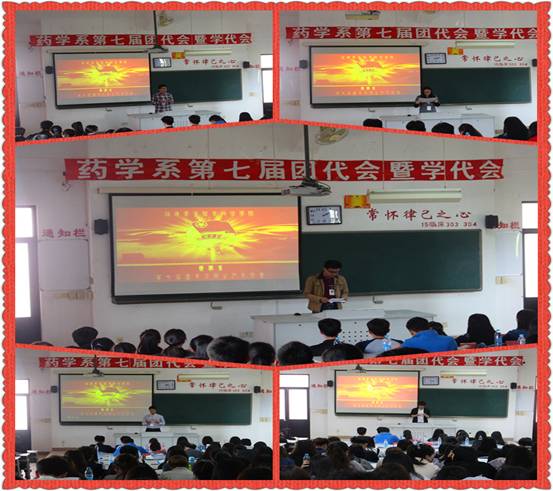 大会在一段精彩的视频中拉开帷幕。系第六届团总支委员会委员杨键伟同学首先致开幕词,院团委宋维书记向大会致贺词。会上,药学系团学代表们分别听取并审议通过了药学系团总支书记李宝珠老师、学生会主席陈宝龙同学的工作报告。按照共青团基层组织选举办法和学生会工作相关要求,团代会、学代会的代表和候选人均由各班民主产生。秉承公平、公正、公开的原则,11名团总支委员候选人、27名学生会委员候选人分别上台发表竞职演说,通过不记名投票方式选举产生第七届团学委员。最后,团总支候选人李志鹏等7名同学,学生会候选人刘少华等22名同学成功竞选。