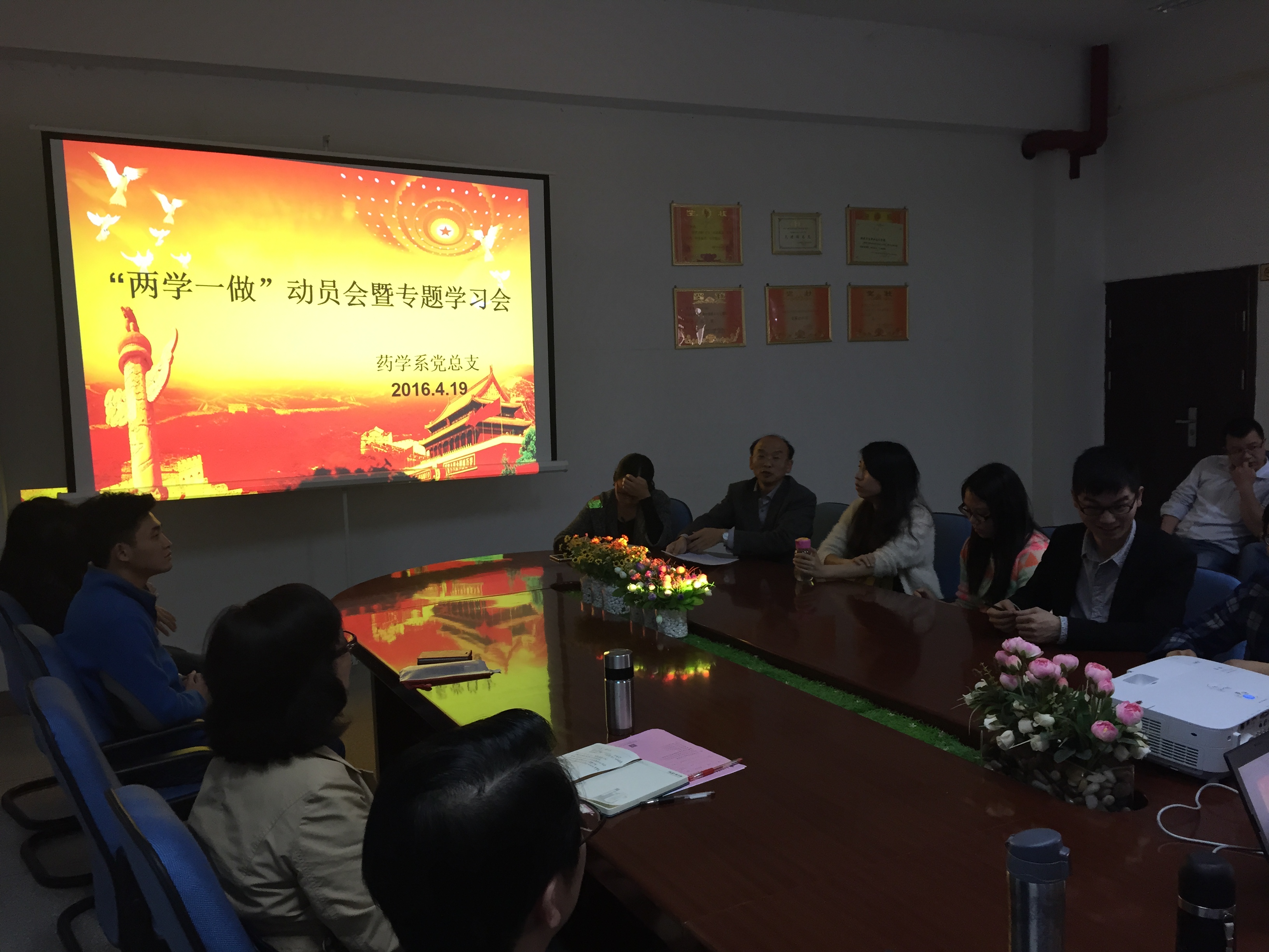 4月19日下午3:10,药学系党总支在系会议室召开“两学一做”动员会暨专题学习会。会议由系党总支书记苏爱华主持,药学系全体党员参加。