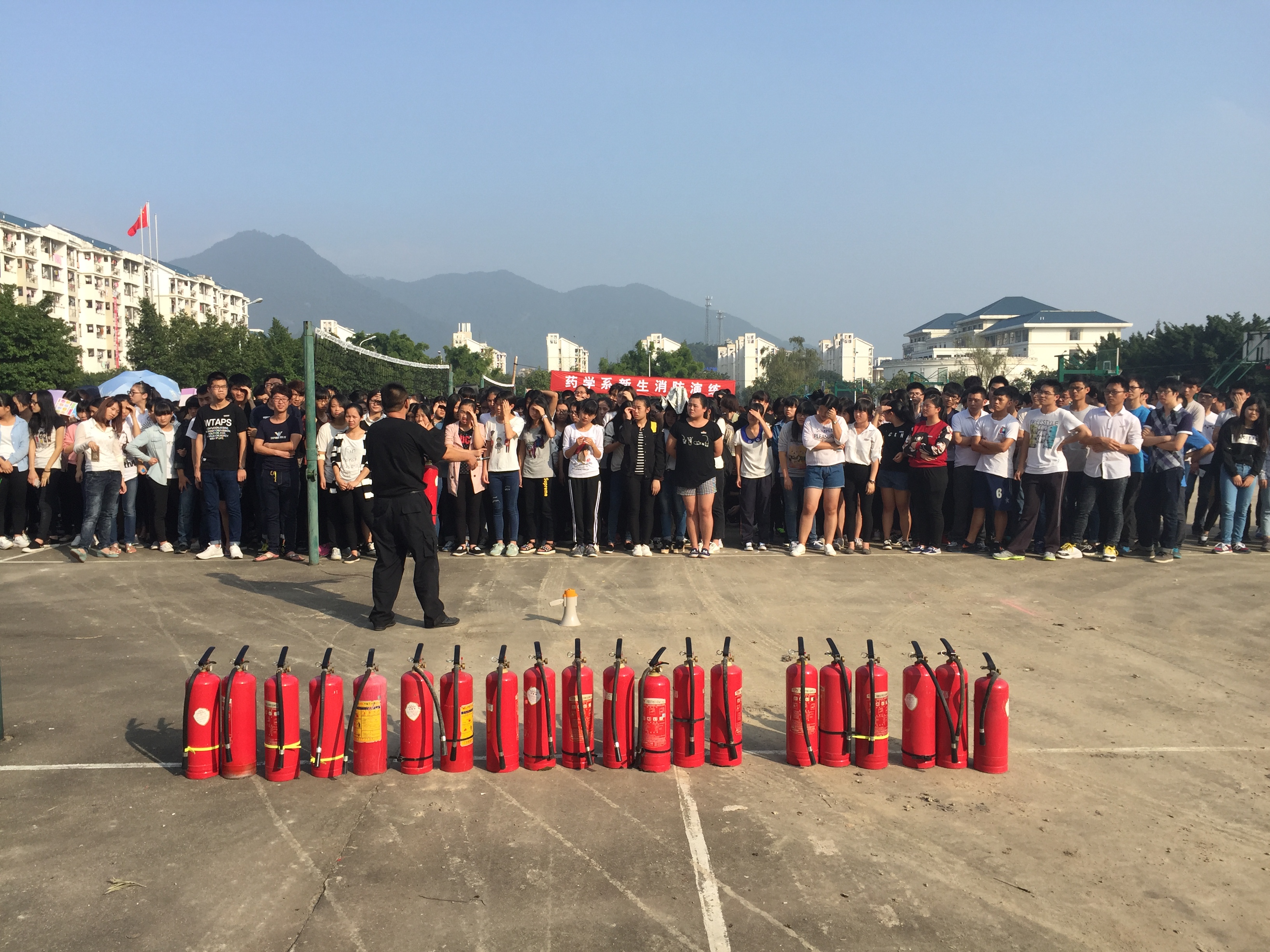 为了进一步做好安全工作,增强系部师生消防安全意识,本着“预防为主,防消结合”的消防工作方针,药学系全体15级新生和教职工于2015年11月17日下午在校篮球场举行“油盆灭火”消防演练,闽侯县消防中队刘教官、学院保卫处武刚老师、林捷老师等莅临现场指导。