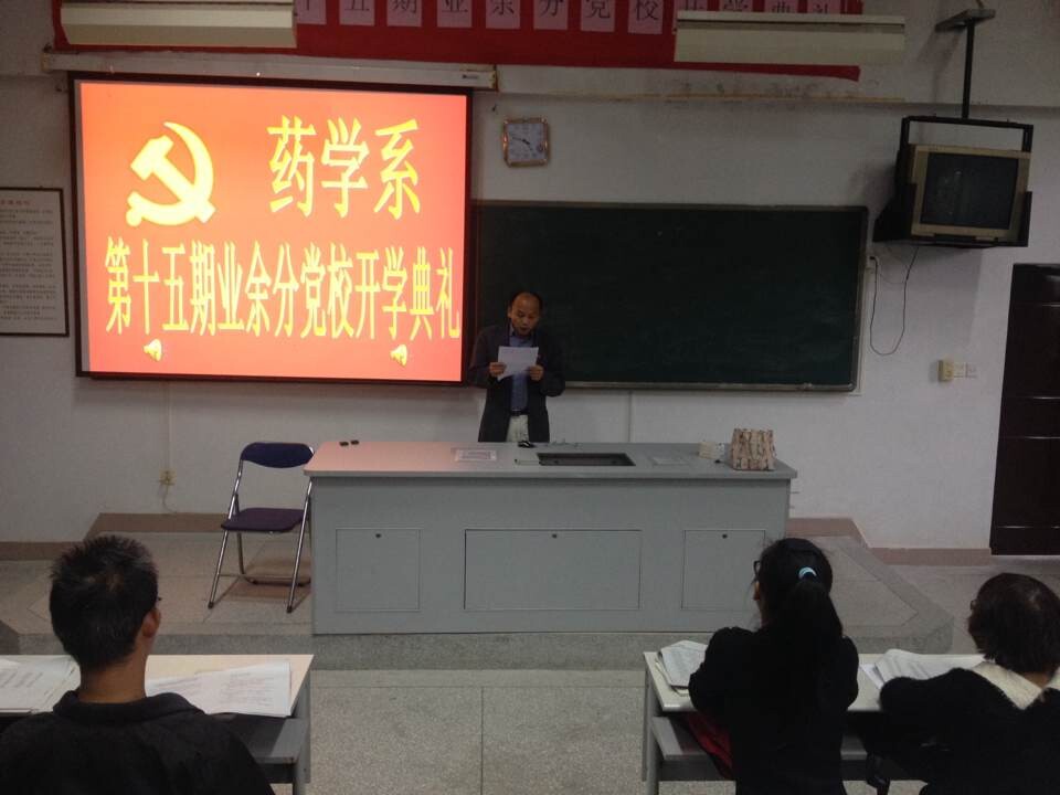 2014年11月11日,药学系第十五期业余分党校于药学系二阶召开,莅临本次大会的领导以及老师有药学系党总支苏爱华书记,药学系第一党支部书记叶雅沁老师,药学系第二党支部书记何舒澜老师,药学系第三党支部书记陈瑜老师,药学系团总支书记林丽凤老师以及团总支副书记李宝珠老师。