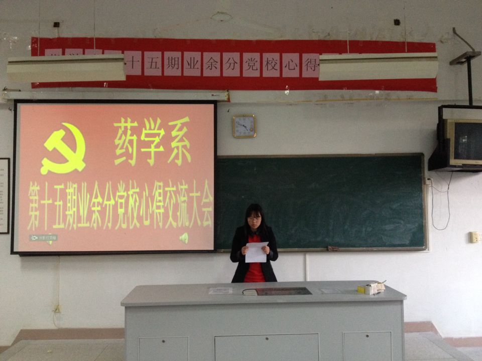 12月16日下午4:20,药学系于系部二阶开展药学系第十五期业余分党校心得交流大会。莅临本次大会的领导以及老师分别是:药学系团总支副书记李宝珠老师,辅导员胡丹老师,黄嵩梅老师。