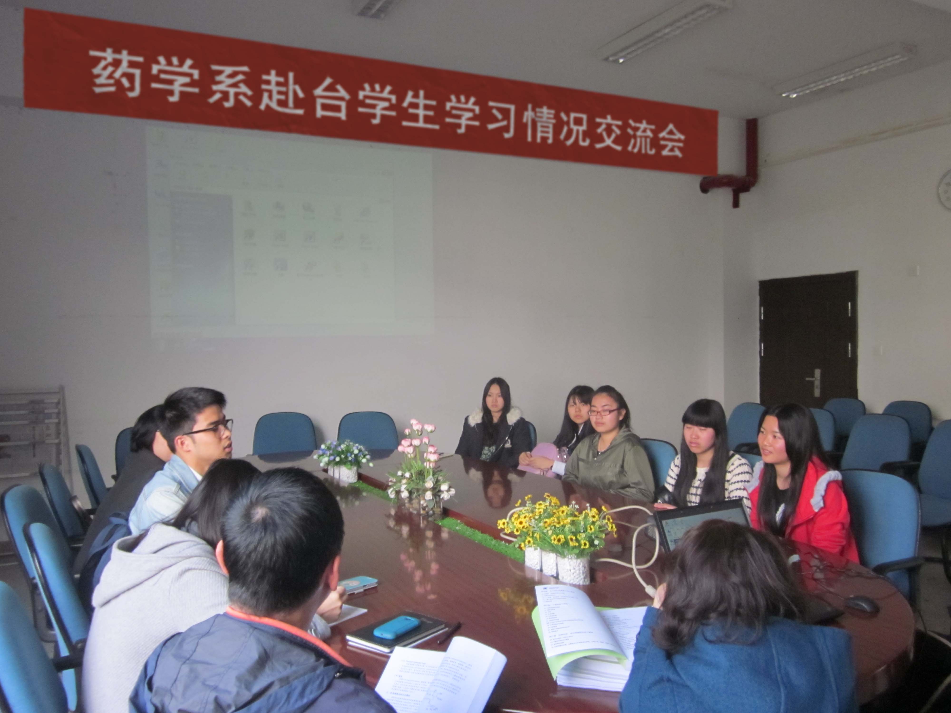 2014年2月26日下午,在药学系会议室召开了赴台学生学习情况交流会。2012级药学专业的6位同学、药学系肖健副主任、本次赴台的指导老师邱腾颖老师以及冯珊老师、林颖峰老师、教学秘书康婷婷老师以及辅导员林丽凤老师参加了交流会。