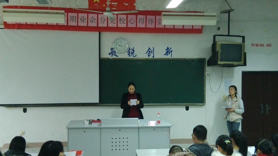 药学系第十三期业余分党校心得交流大会于12月10日下午在药一阶召开了。出席本次大会的老师有药学系团总支书记陈洁老师,辅导员胡丹老师,李宝珠老师。