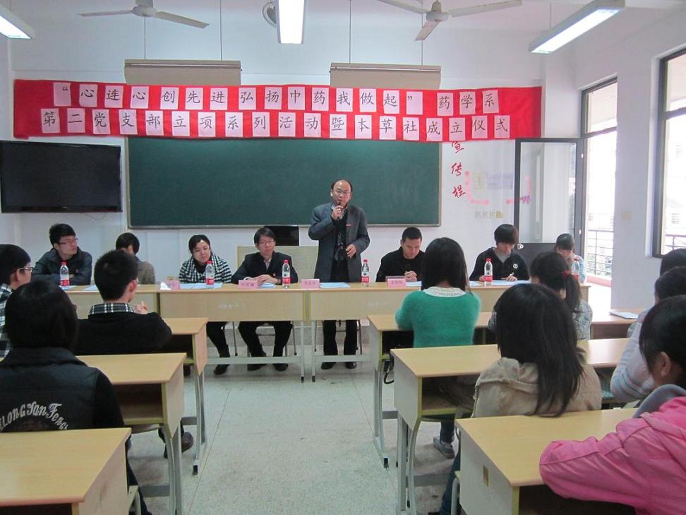 我系于2012年11月27日下午在教学楼201教室举行药学系第二党支部立项系列活动暨本草社成立仪式。系党总支苏爱华副书记、系第二党支部书记何舒澜老师、系第二党支部委员潘雪丰老师、系团总支书记王钝锐老师参加了本次大会。