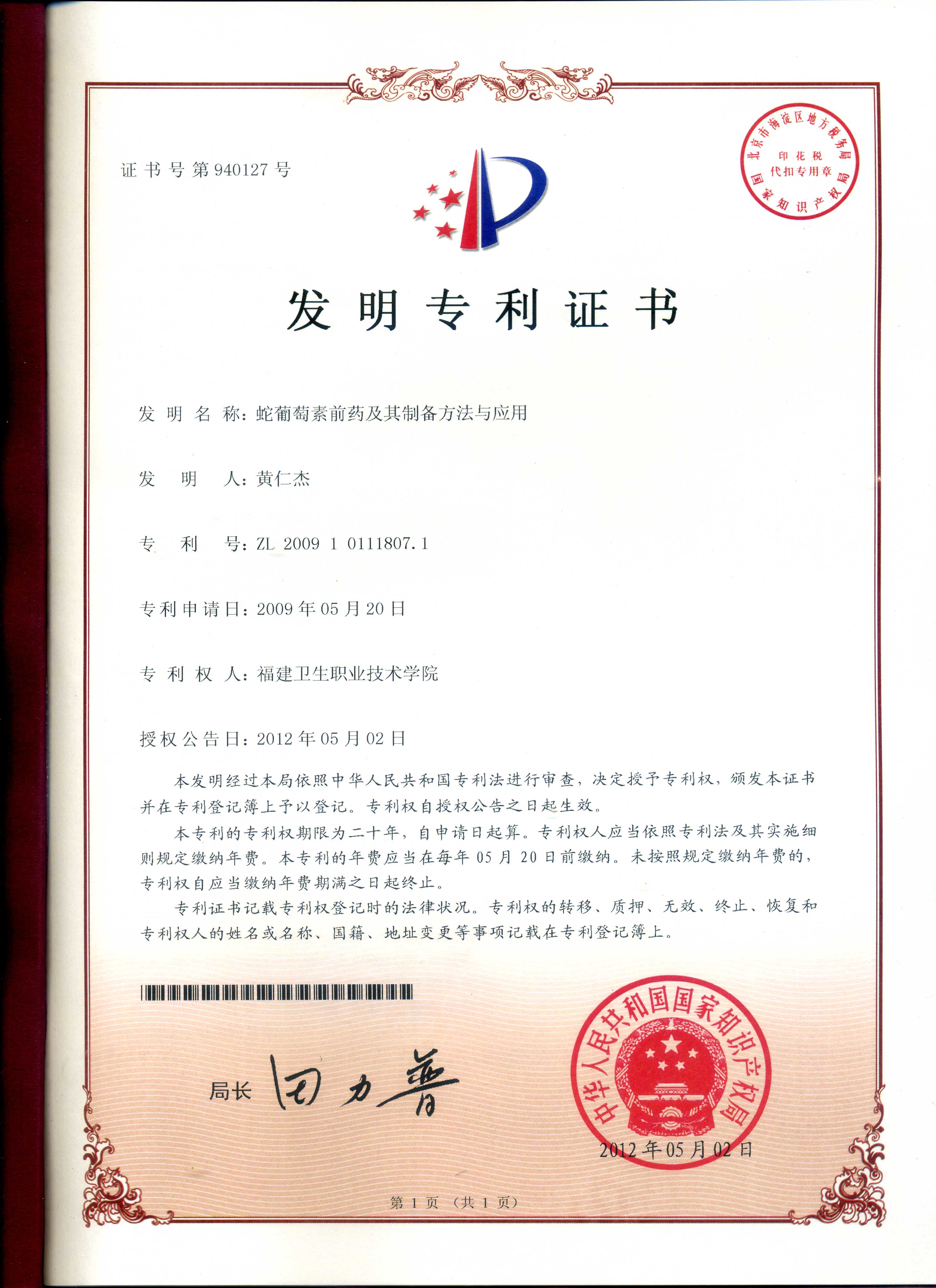 日前,我院食品药品研究所黄仁杰副教授研究的成果“蛇葡萄素前药及其制备方法与应用”获国家知识产权局颁发国家发明专利证书(专利号:ZL200910111807.1),授权公告日为:2012年5月2日。