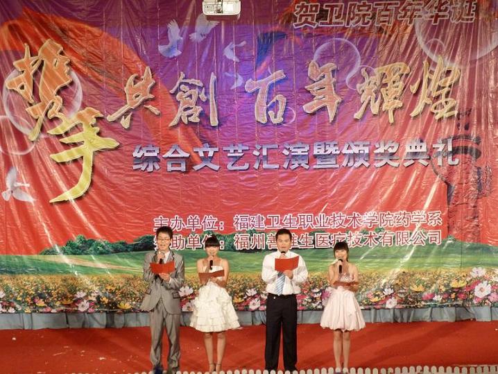 我系于5月13日晚在学术厅隆重举行了药学系 “携手共创 百年辉煌”综合文艺汇演暨颁奖典礼,本次晚会得到福州善维生医疗技术有限公司友情赞助。学院党委严肃书记、黄开良副院长、魏立娜副院长、学生工作处黄铭珊处长、福州善维生医疗技术有限公司陈曦总经理、学院团委宋维副书记、药学系党总支苏爱华副书记、护理系团总支书记林媛老师、医学技术系团总支书记黄小芳老师、临床医学系团总支书记陈盛兰老师和药学系各班辅导员、班主任老师莅临晚会现场。