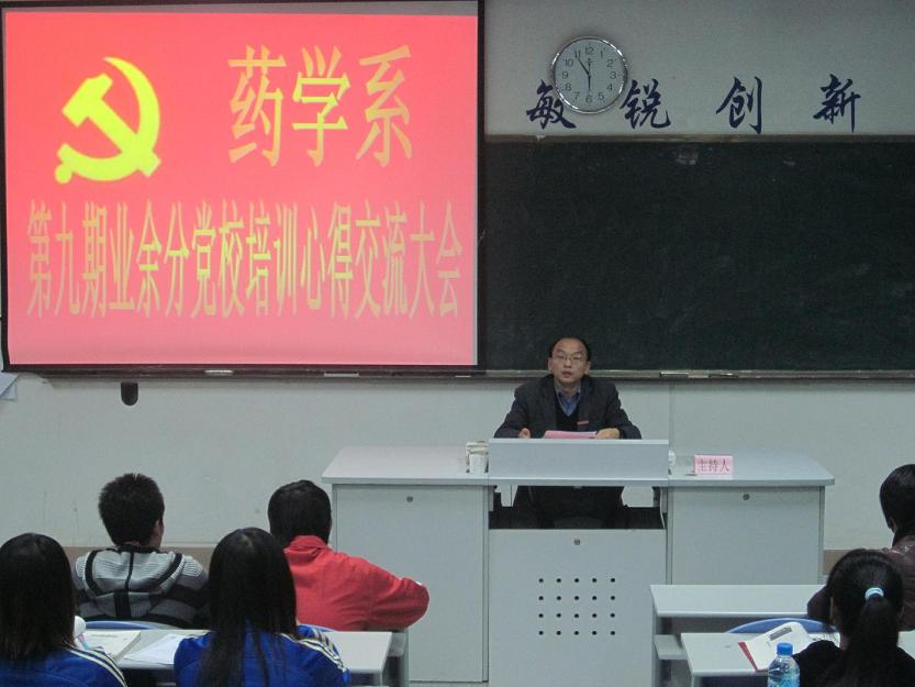 我系第九期业余分党校培训心得交流会于12月15日下午在药学系第一阶梯教室举行,系党总支苏爱华副书记,系团总支书记王钝锐老师,系团总支副书记陈炳秀老师出席了本次交流会。