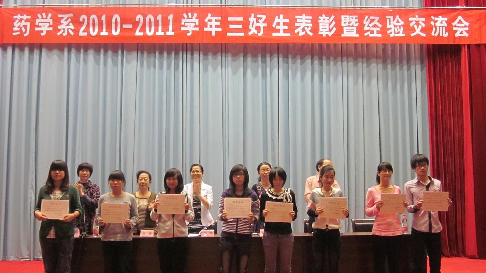 10月25日下午我系在学院学术厅举行药学系“2010—2011学年三好生表彰暨学习经验交流会”。院学生工作处黄铭珊处长、系倪峰主任、苏爱华副书记、林小兰副主任、陈穗副主任、及我系全体辅导员出席了本次大会,大会由林小兰副主任主持。