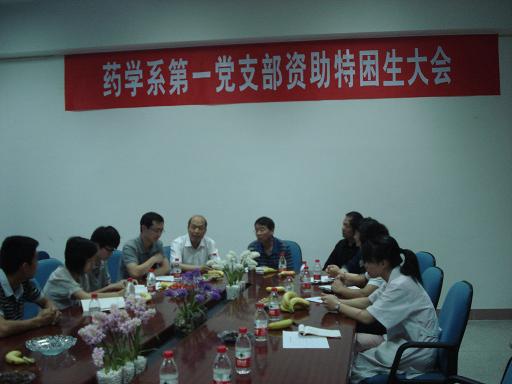 药学系第一党支部于2010年6月9日下午四点在药学系会议室召开资助特困生大会。院党委陈雄副书记、第一党支部全体党员及21名资助对象参加了本次大会。
