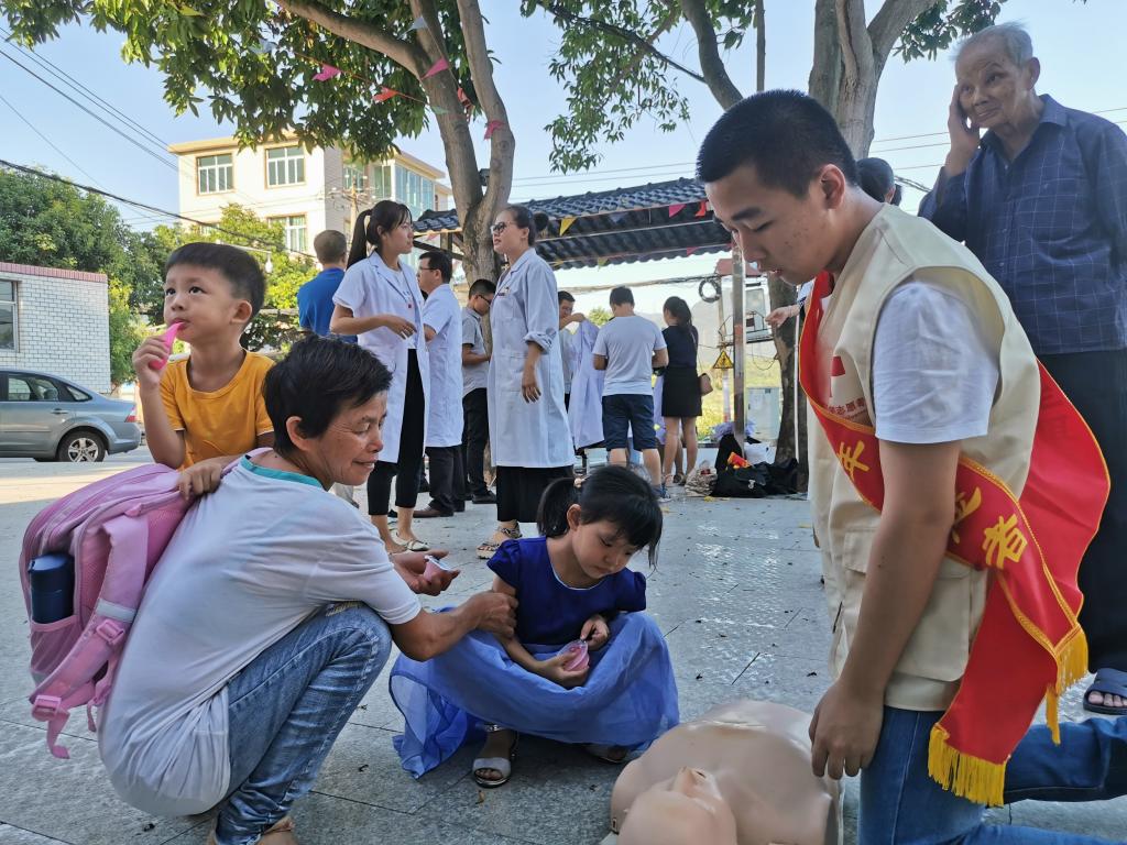 义诊开始之前,志愿者们携带着饱满的热情,从置办场地到人员的迅速就位,再到医疗器械的检测,整个过程一丝不苟,认真负责。此次义诊内容主要为测血压、急救知识培训、健康咨询、特色花茶等。活动的过程中,学生志愿者们认真的为村民进行测量,用言语去交流,用耳朵去倾听,给予就诊者所需注意的问题,邓元荣等老师则针对不同病症和个体差异对村民提出合理的诊疗建议,还为村民们讲解使用药品和保管药品注意事项。考虑到天气的炎热,志愿者给体检的村民送上我系自制的特色花茶,消暑解渴。