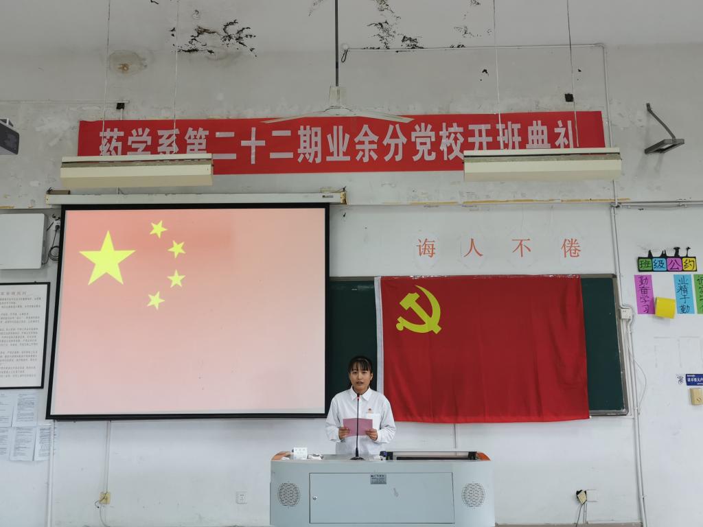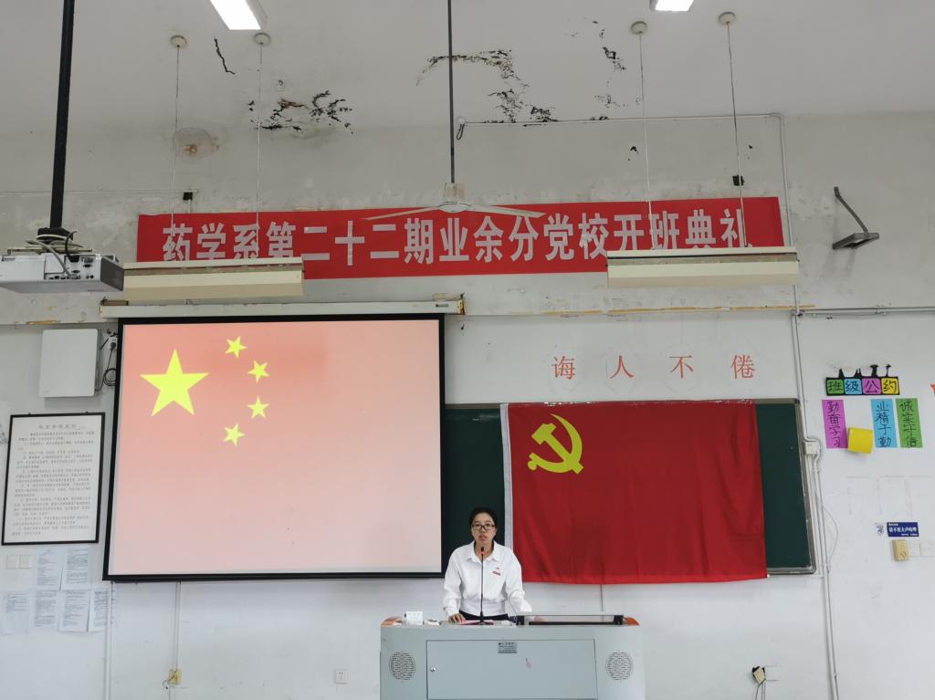 开班仪式在庄严的国歌中拉开序幕。会议伊始,药学系党总支副书记赖文金宣布本期业余分党校学员名单。18中药学301班李柳柳同学代表全体学员发言,表示将以饱满的热情和实际行动完成好党校学习任务,自觉遵守党校纪律和制度,认真完成学习,在党校结业考试中努力向党组织交一份满意的答卷。培训期间不断强化思想觉悟,提高党性修养,增强勇于担当的责任意识,将深厚的爱国情怀融入到刻苦学习和努力奋斗的实践中。药学系关工委常务副主任欧春木在致辞中对参加本次党校学习的学员表示祝贺,并提出了几点要求:他指出参加党校学习不仅是一份荣誉,也是展示同学们精神风貌的一扇窗口,更是一份沉甸甸的责任;希望全体学员要珍惜学习机会,认真学习党的基本理论与基础知识,加强党性修养,从思想上提升对党组织的认同感、归属感,坚定不移跟党走,用实际行动向党组织靠拢。