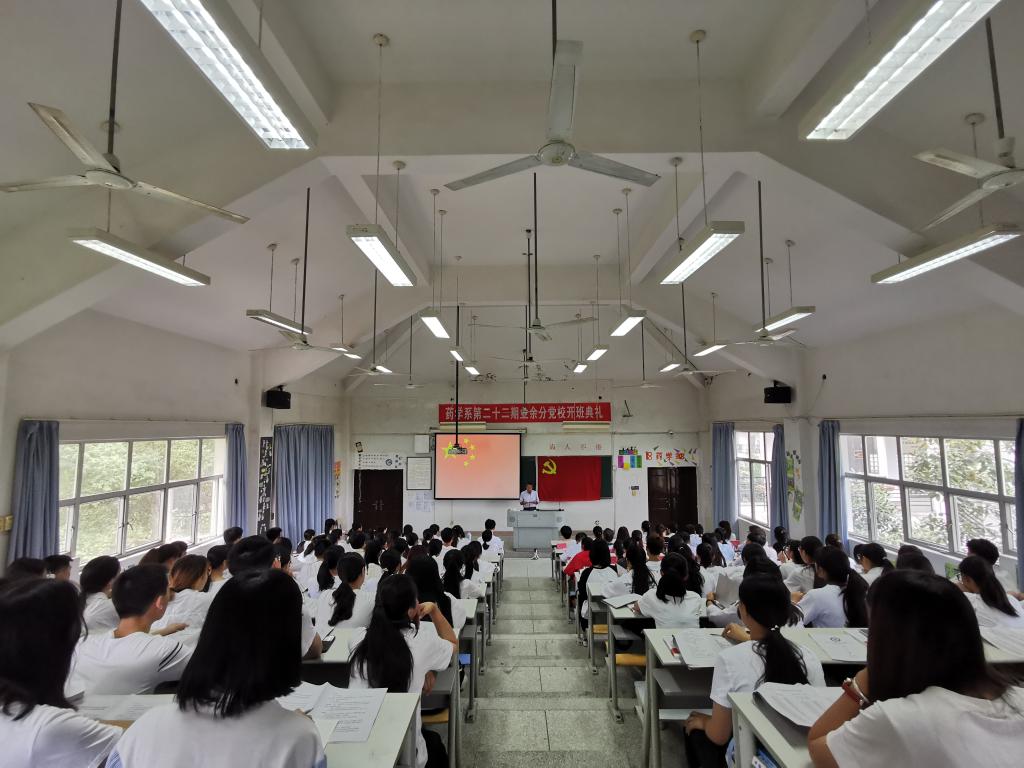 不忘初心跟党走,牢记使命强党性,2019年10月15日,药学系党总支于药二阶召开第二十二期业余分党校开班仪式,药学系关工委常务副主任欧春木、党总支书记郑力宏、党总支副书记赖文金、副主任潘雪丰、党总支专职组织员黄嵩梅,党总支委员叶雅沁、支部书记、全体辅导员及分党校99名学员到场参会。
