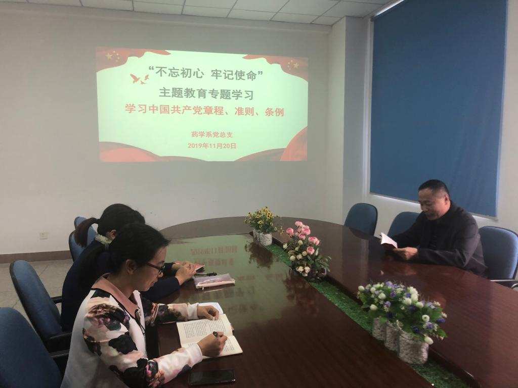 11月20日下午,药学系党总支在系部会议室开展“不忘初心、牢记使命”主题教育专题学习研讨交流会,药学系党总支书记郑力宏主持会议,党总支副书记赖文金、副主任潘雪丰参加本次研讨。