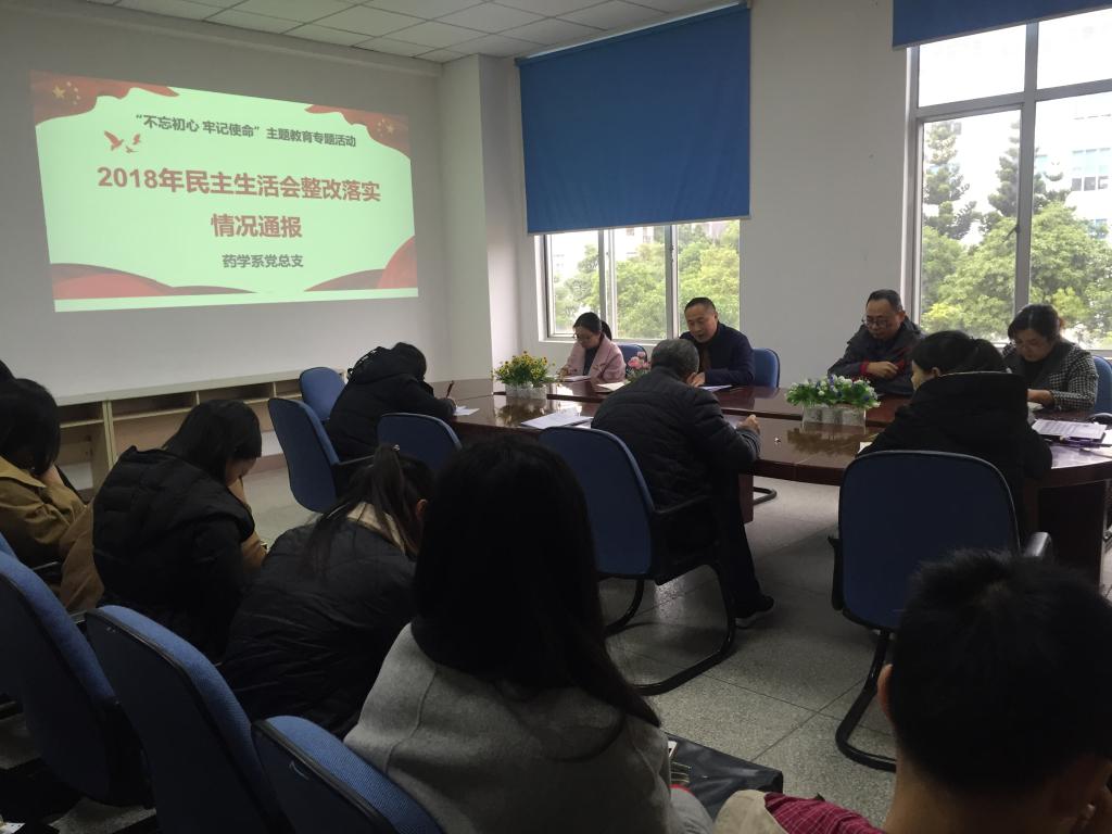 2019年12月5日,药学系党总支在系部会议室召开2018年民主生活会整改落实情况反馈会,药学系全体教职工到场参会,会议由药学系党总支郑力宏书记主持。