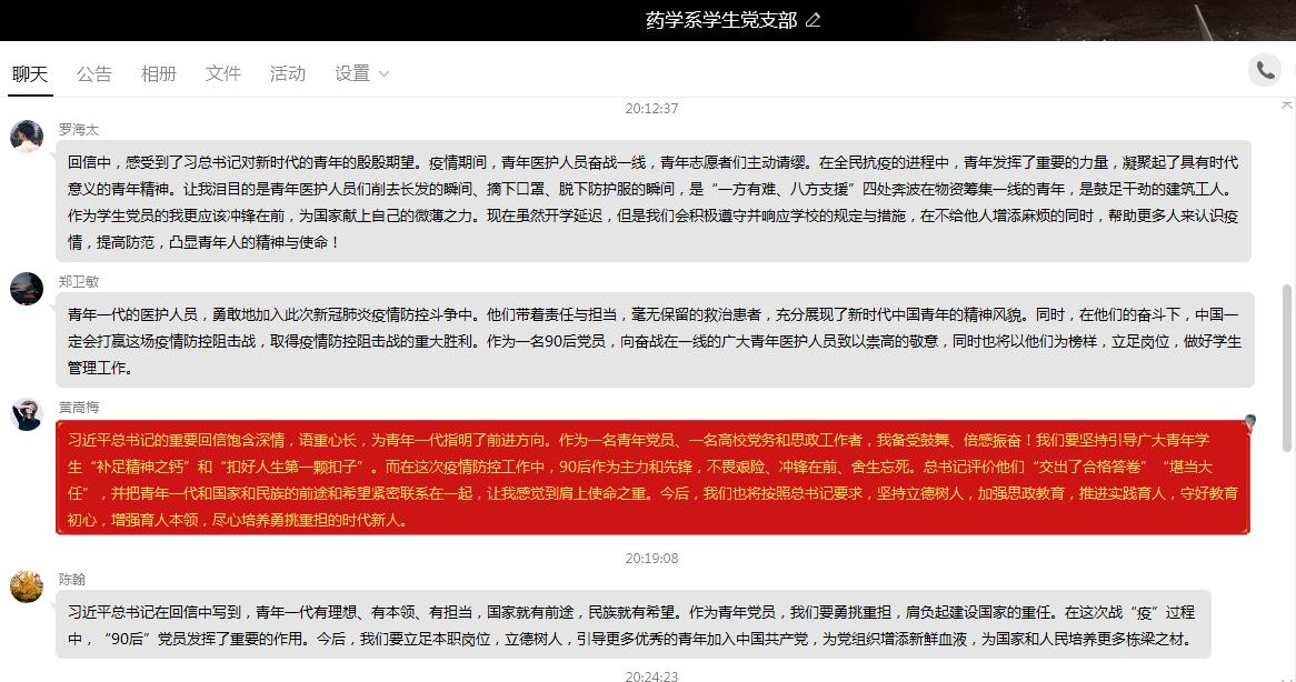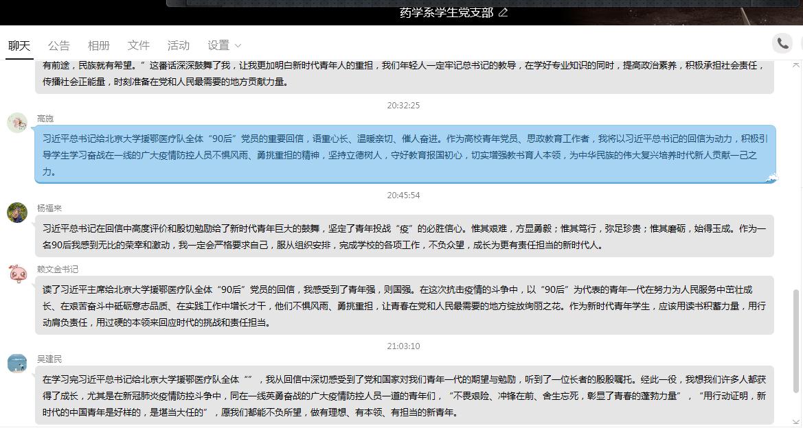 近日,北京大学援鄂医疗队的34名“90后”党员给习近平总书记写信,汇报了在抗疫一线抢救生命的情况,表达了继续发挥党员作用、为打赢疫情防控阻击战贡献力量的决心。总书记3月15日回信,激励新时代青年要不惧风雨、勇挑重担,让青春在党和人民最需要的地方绽放绚丽之花。据此,3月28日,药学系学生党支部开展主题党日活动,学习习近平总书记给北京大学援鄂医疗队全体“90后”党员的回信精神。