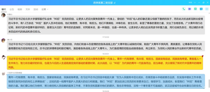 疫情防控是一场人民战争,每个党员都是一面旗帜,可以感召一群人、带动一群人,汇聚起更强大的战疫力量,在疫情防治攻坚时间,习近平总书记回信勉励北京大学援鄂医疗队全体“90后”,给优秀的青年医务工作者发出了最强音量。为深入学习贯彻落实习近平总书记的回信精神,2020年3月26日,药学系第二党支部开展“抗疫路上,共同的初心”主题党日活动,学习“习近平回信勉励北京大学援鄂医疗队全体“90后”,将疫情防控工作落实到具体的教学工作中。
