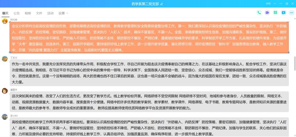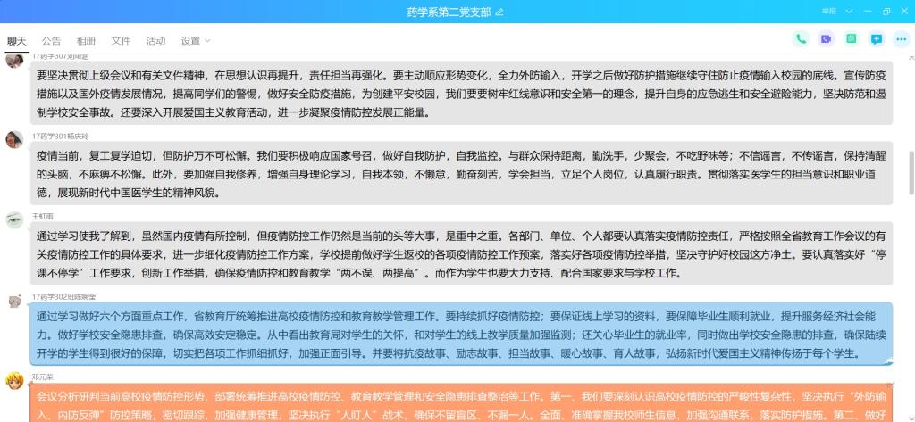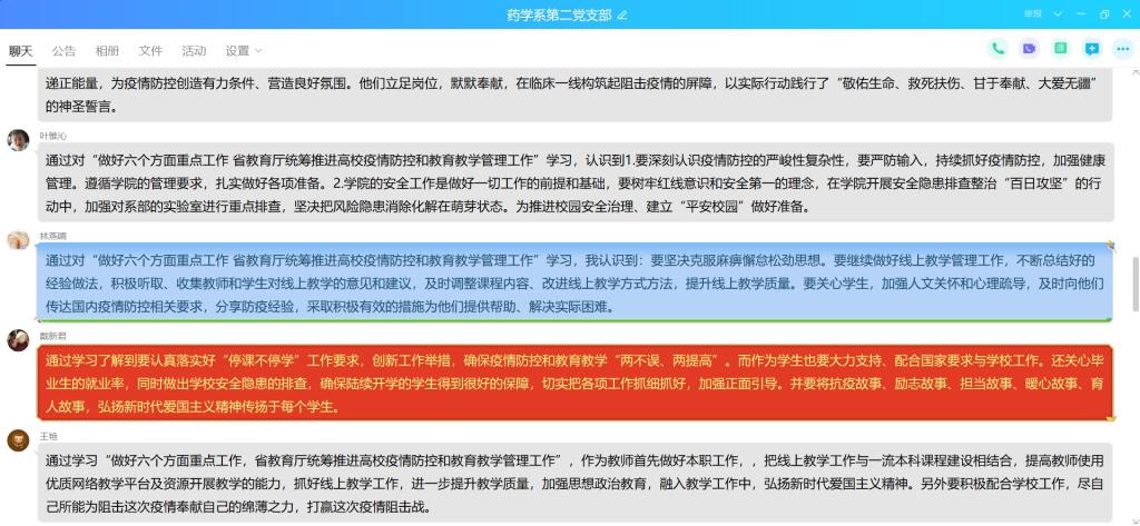 为了加深对疫情防控工作严峻性的认识,进一步做好疫情防控期间线上教育教学管理工作,2020年4月3日,药学系第二党支部组织全体成员在微信群集中学习福建省教育厅统筹推进高校疫情防控和教育教学管理工作视频会议精神。
