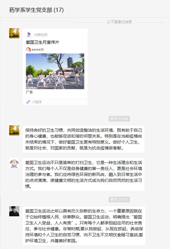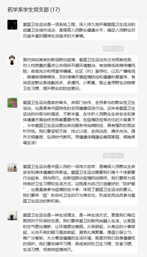 爱国卫生人人受益,疫情防控人人有责。6月16日,药学系学生党支部通过微信平台,观看“爱国卫生月宣传片”,集中学习爱国卫生运动精神。
