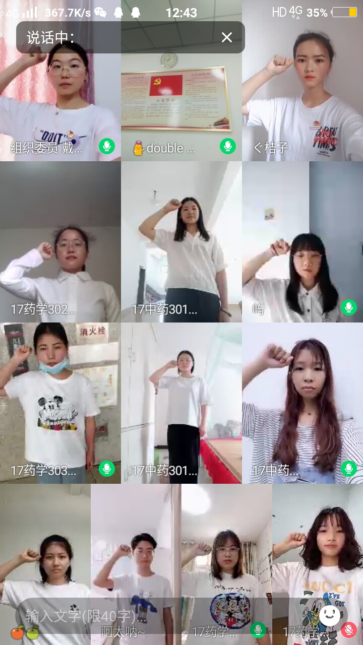 2020年6月15日,药学系党总支在系部会议室、QQ平台举行新党员线上入党宣誓仪式,药学系党总支书记郑力宏、副书记赖文金、支部支委及2019年下半年新发展党员一起参加了线上入党宣誓仪式,仪式由郑力宏书记主持。