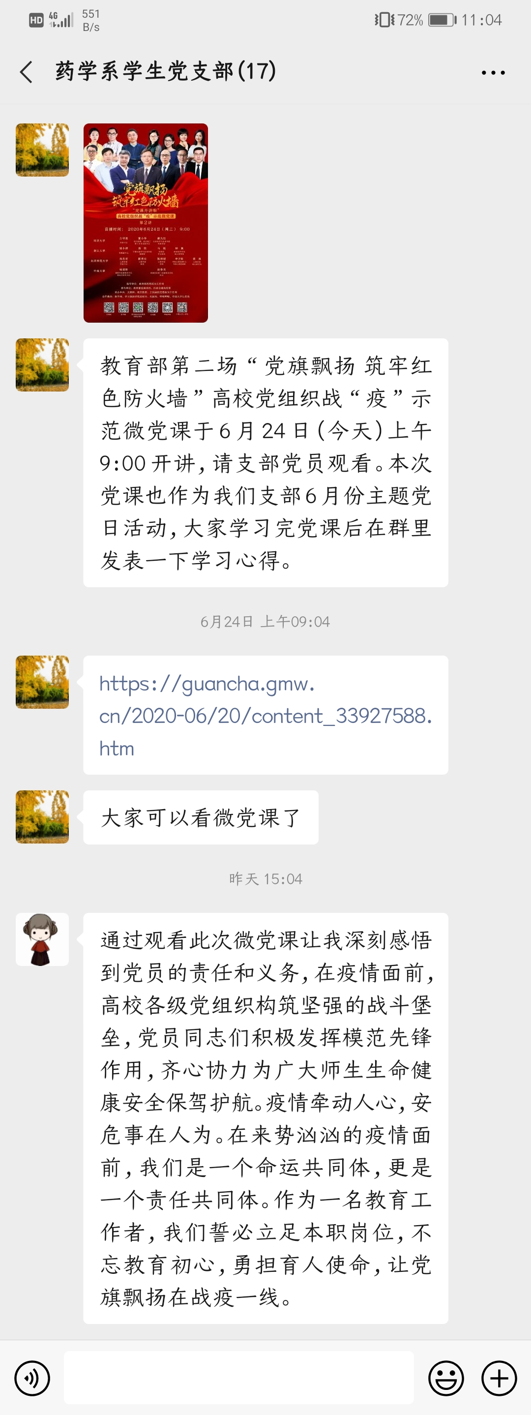 6月24日,药学系学生党支部通过网络平台,开展主题党日活动,集中观看教育部“党旗飘扬,筑牢红色防火墙”高校党组织战“疫”示范微党课。