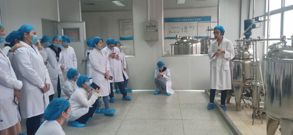参观现场,首先林燕喃老师代表系部对学生们的到来表示热烈欢迎,并对药物制剂实训车间基本情况作简单介绍。随后林燕喃老师、倪敏老师分批带队进入实训车间进行参观,向学生们详细讲解了实训车间的固体制剂、液体制剂及中药提取等生产线运作情况。