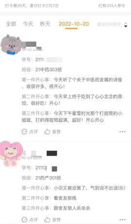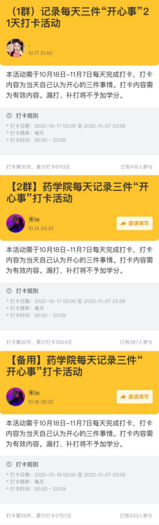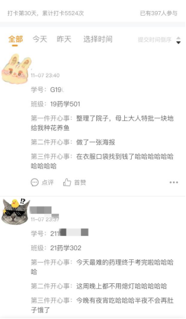 本次,药学院以每天记录三件“开心事”21天打卡活动为主推,组织同学们线上打卡“开心事”,引导同学们学会多发现生活中美好的人和事,以积极向上的心态面对生活,此次活动吸引力千余名学生参与,累计打卡人次超1.4万。