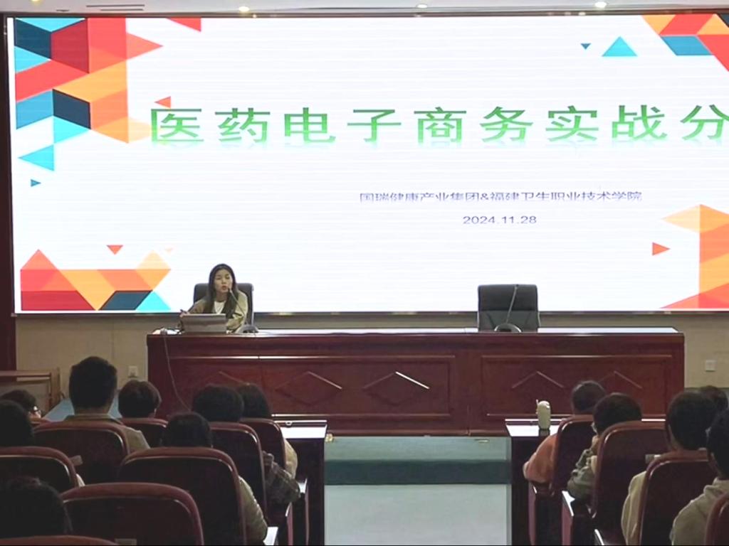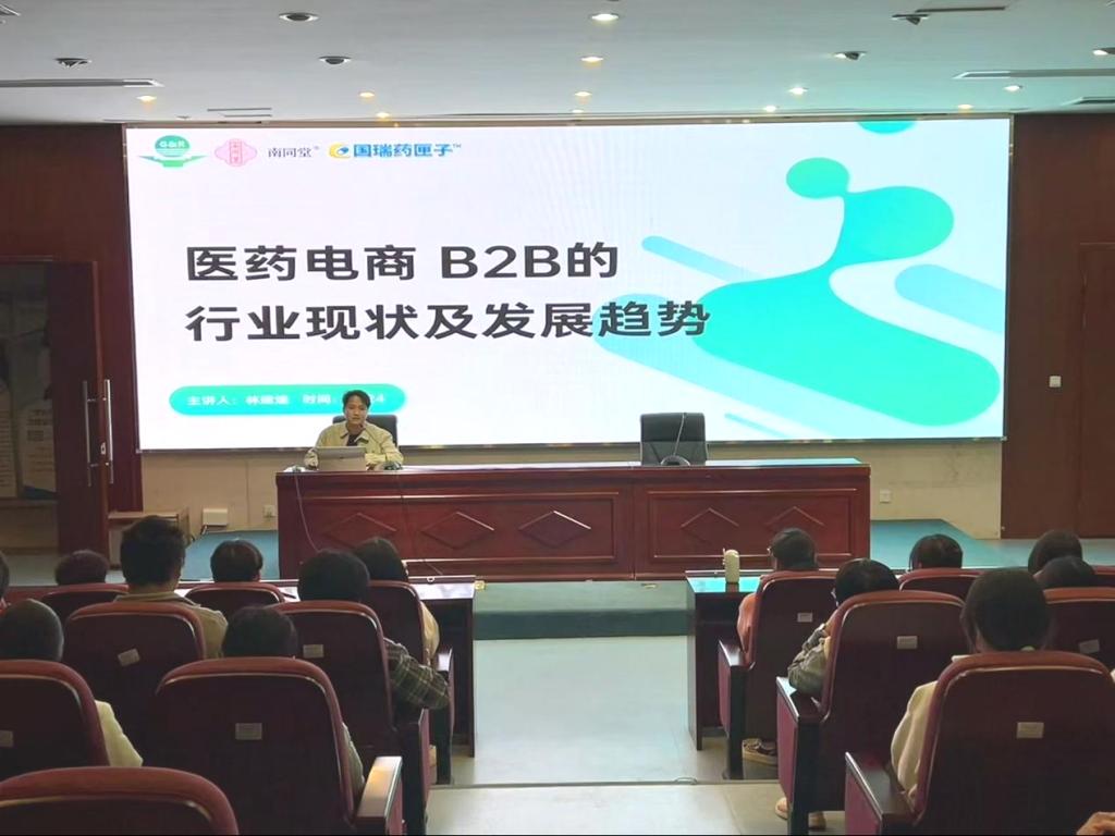 福建国瑞药业有限公司集团销售事业部总经理林建煜、人资行政总监许雨珊、商品部总监刘希婷、销售部总监郑凌枫来校为药学院师生开展了“医药电商的运营模式和职业成长路径”的专题讲座。4位管理者分别讲授了企业组织架构、医药电商B2B的行业现状及发展趋势、C端医药电商市场现状分析、商品部在企业中的作用与价值,为学生未来的医药电商职业发展奠基坚实的基础。