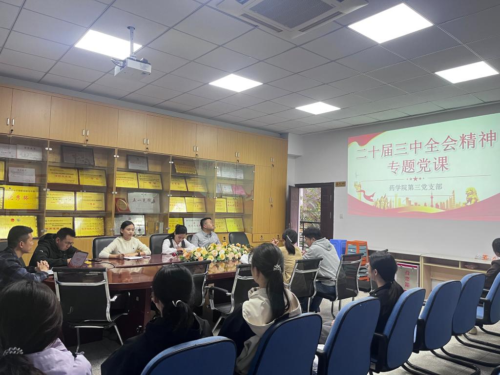为深入学习贯彻党的二十届三中全会精神,11月20日下午,药学院第三党支部在药学院会议室开展学习贯彻党的二十届三中全会精神专题党课。