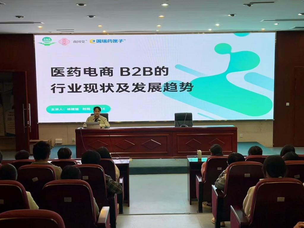 国瑞健康产业集团林建煌和郑凌枫给同学们着重分享了三方面的内容。一是医药电子商务实战经验分享,二是医药电商B2B的行业现状及发展趋势,三是C端医药电商市场现状分析。