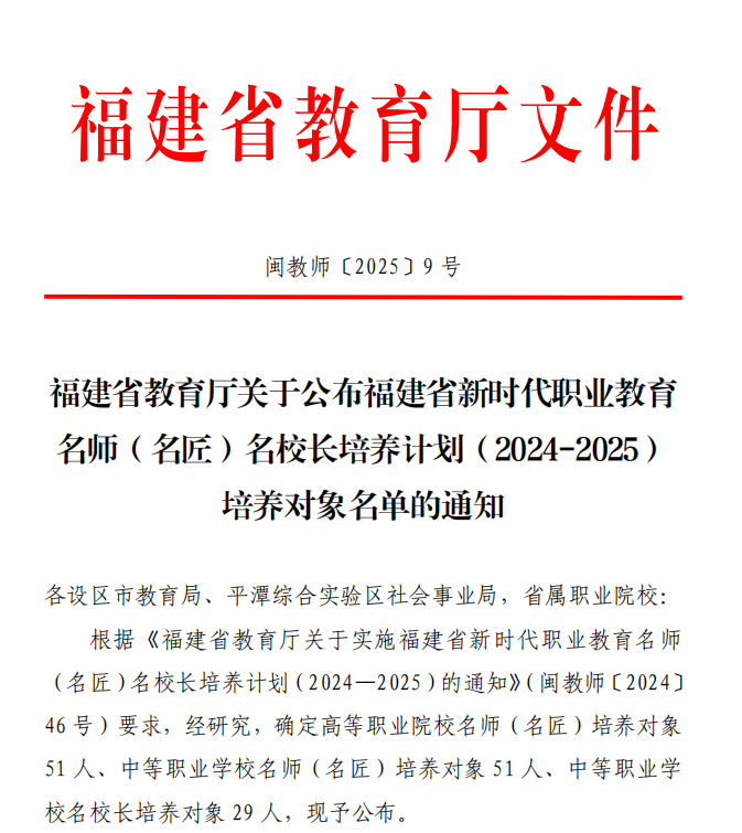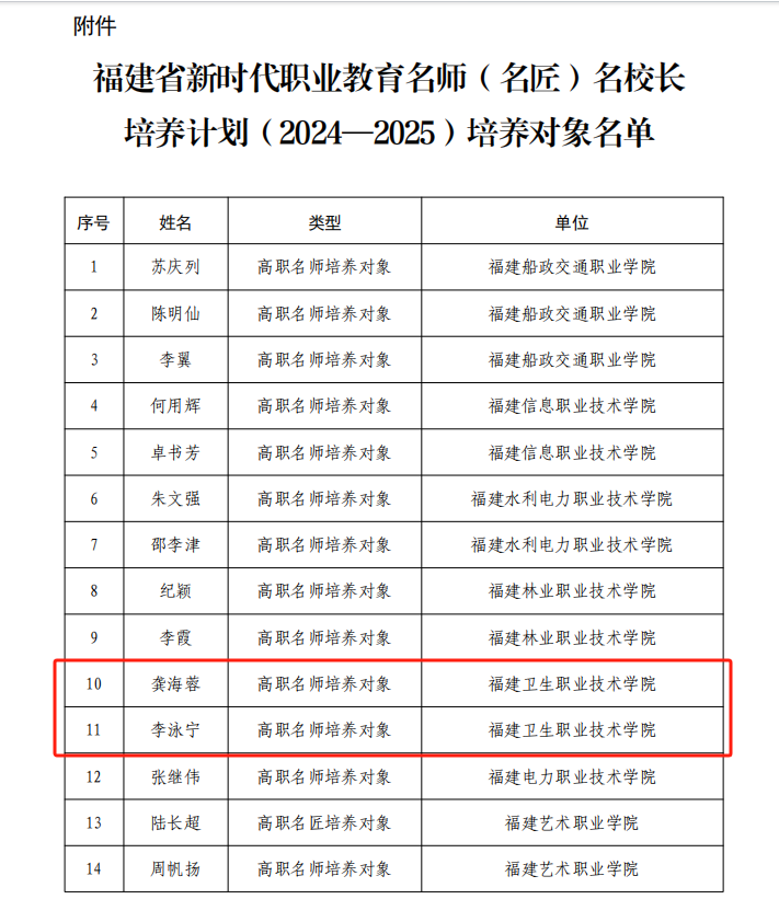 近日,福建省教育厅公布《新时代职业教育名师(名匠)名校长培养计划(2024-2025)培养对象名单》,开云龚海蓉、李泳宁两位教师成功入选福建省新时代职业教育高职名师培养对象。