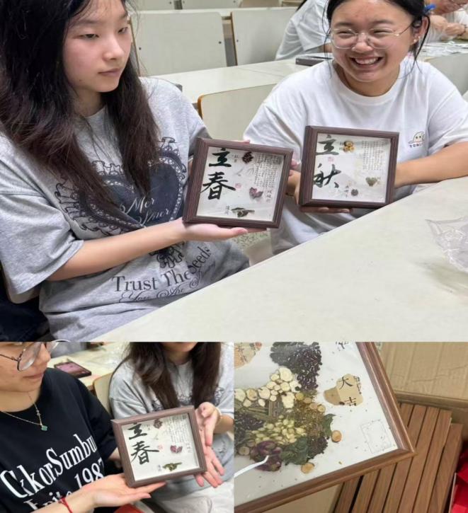 活动围绕“识本草、制画品、传心意”三大环节展开。“节气本草识”环节,同学间交流与“二十四节气”相关的草本植物特性,如立春的辛夷、立秋的菊花等;“画品手作”环节,同学们精选各类草本药材,巧妙搭配成“立春”“立秋”等节气主题的本草画,也将对心理健康的期许融入创作。同学们专注于药材摆放、装裱,在沉浸式创作中释放压力,每一幅本草画都成为独一无二的心灵载体。