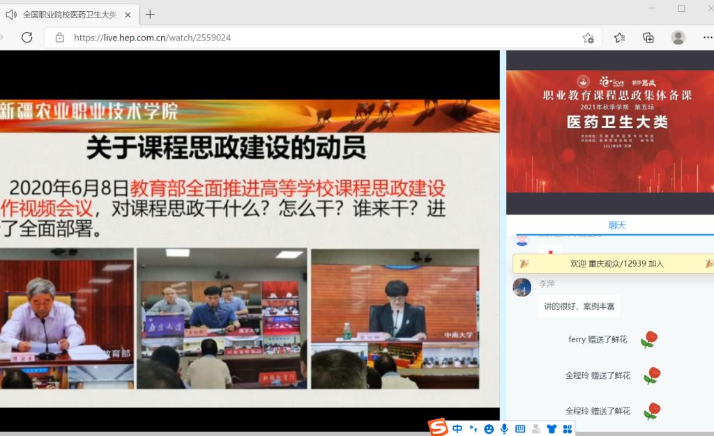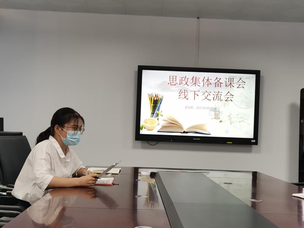为强化课程思政建设,将课程思政贯穿教育教学全过程,着力培养学生“敬佑生命、救死扶伤、甘于奉献、大爱无疆”的医者精神,实现课程育人目标,落实立德树人根本任务。2021 年 9 月 25 日至26 日,医学系组织教师在线观看《全国职业院校医药卫生专业大类课程思政集体备课》,并于9月30日在实训楼311会议室围绕医药卫生专业大类课程思政示范课程建设开展交流研讨。