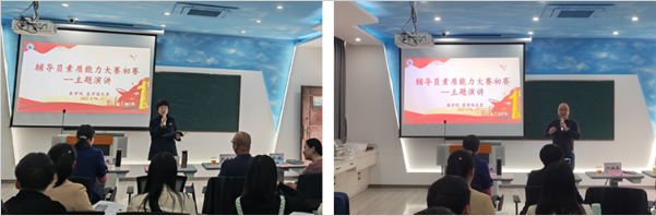 比赛现场,两个院系党总支书记柯琼莺、邱滚忠为辅导员们精彩的表现进行点评。