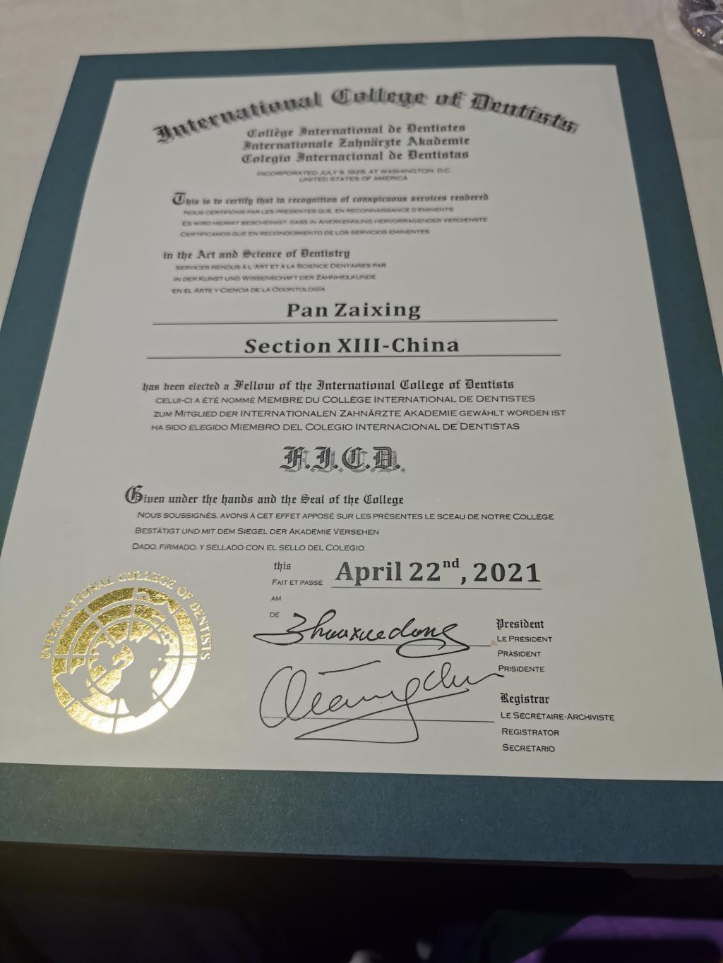 国际牙医师学院是国际三大口腔医学组织之一,由全球在口腔医学领域取得杰出成就和优良服务的最优秀的牙医精英组成,是世界牙医学方面杰出贡献者的最高荣誉专业评价机构。国际牙医师学院院士称号被业界认为是“全世界牙医师最高荣誉称号”。