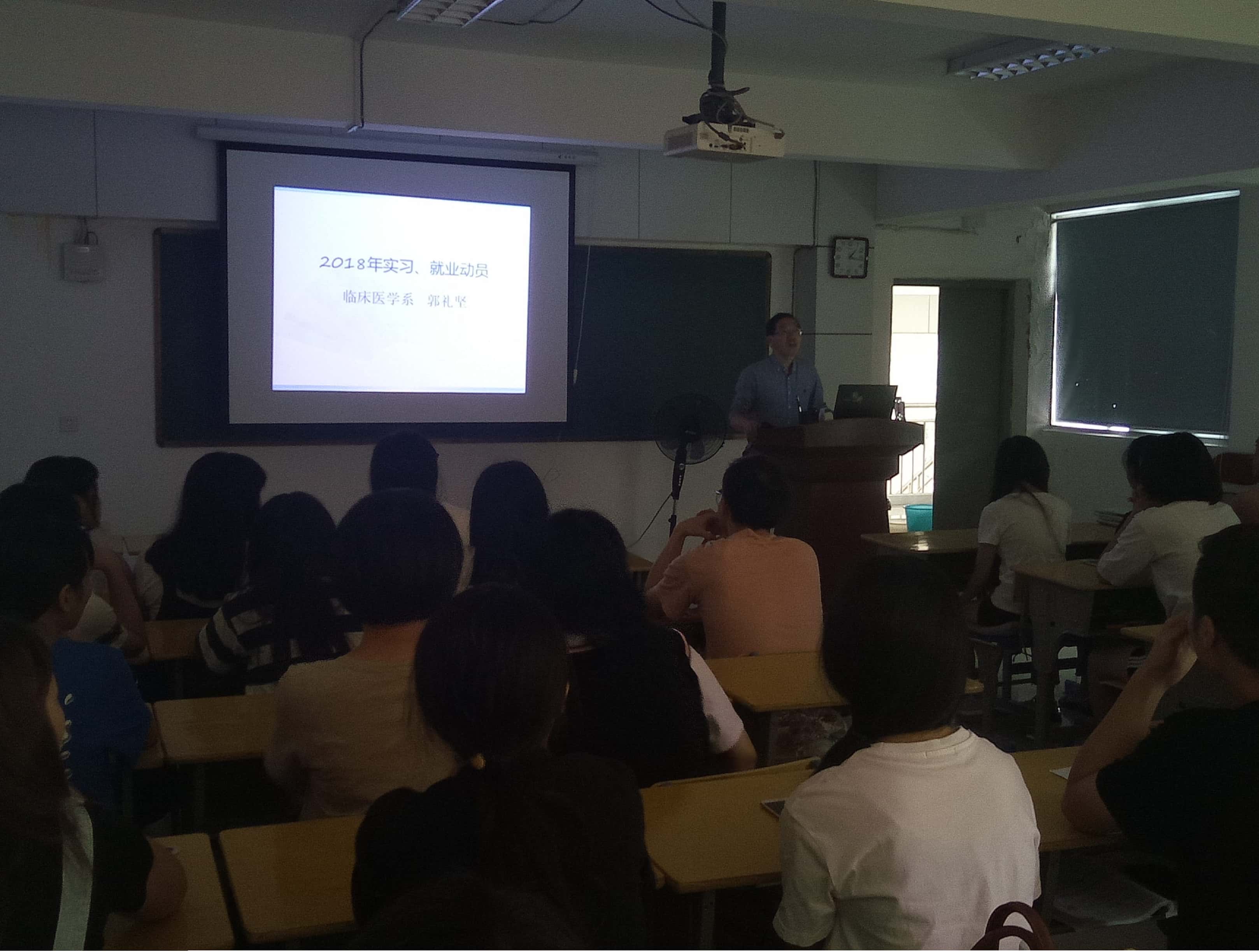 在实习动员大会上,郭礼坚主任首先向同学们介绍了实习的重要性、实习期间的纪律要求,特别强调了实习生要在实习中培养严肃认真的工作态度,杜绝差错事故的发生,要关心病患,关爱生命,希望同学们尽快调整好心态,为实习做好准备;同时,林国威主任、梁艳科长还具体介绍了临床实习的教学要求,实习成绩的评定方法等;金建文老师针对专业角度对同学们进行了动员,强调同学们要认真学习专业知识,为即将到来的实习做好充足准备,同时要注意实习中的医疗安全,学会处理好工作中的社会关系;辅导员刘景城老师现场解答了学生的实习相关问题。通过此次实习动员大会,使得即将进入临床实习的同学们对实习有了深入的了解和全面的认识,更加明确了实习的目的和重要性,相信大家一定会在实习中以饱满的热情和良好的状态完成实习任务,并收获累累硕果,为今后走上工作岗位打下坚实的基础。